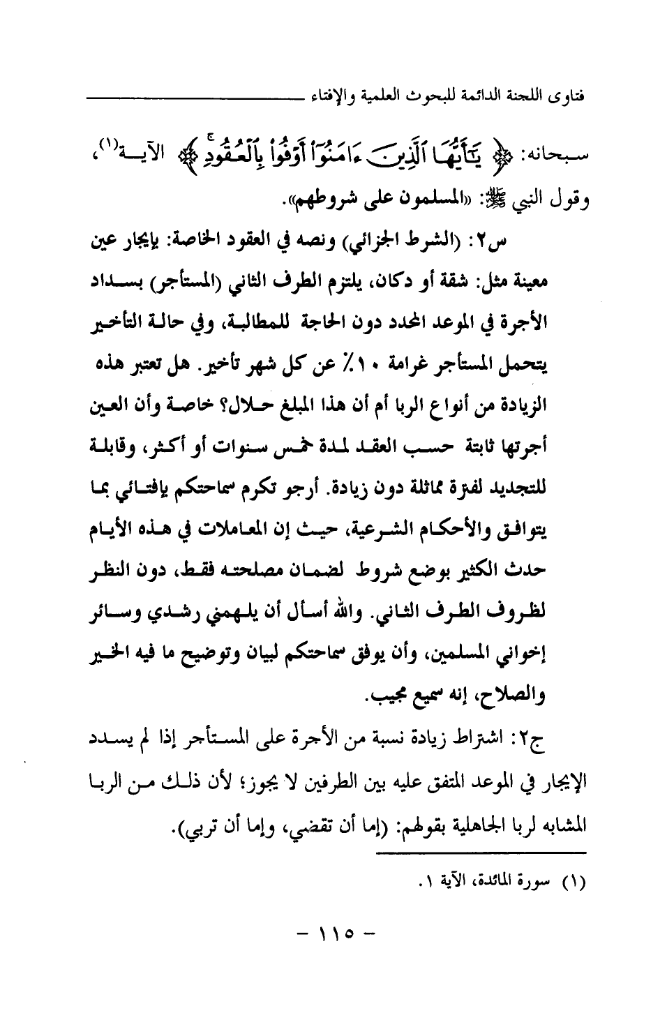 س2: (الشرط الجزائي) ونصه في العقود الخاصة: بإيجار عين معينة مثل: شقة أو دكان، يلتزم الطرف الثاني (المستأجر) بسداد الأجرة في الموعد المحدد دون الحاجة للمطالبة، وفي حالة التأخير يتحمل المستأجر غرامة 10 % عن كل شهر تأخير. هل تعتبر هذه الزيادة من أنواع الربا أم أن هذا المبلغ حلال؟ خاصة وأن العين أجرتها ثابتة حسب العقد لمدة خمس سنوات أو أكثر، وقابلة للتجديد لفترة مماثلة دون زيادة. أرجو تكرم سامحتكم بإفتائي بما يتوافق والأحكام الشرعية، حيث إن المعاملات في هذه الأيام حدث الكثير بوضع شروط لضمان مصلحته فقط، دون النظر لظروف الطرف الثاني. والله أسأل أن يلهمني رشدي وسائر إخواني المسلمين، وأن يوفق سماحتكم لبيان وتوضيح ما فيه الخير والصلاح، إنه سميع مجيب.