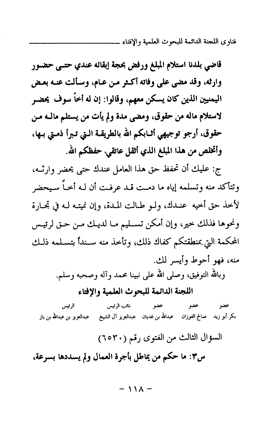 ج: عليك أن تحفظ حق هذا العامل عندك حتى يحضر وارثه، وتتأكد منه وتسلمه إياه ما دمت قد عرفت أن له أخا سيحضر لأخذ حق أخيه عندك، ولو طالت المدة، وإن نميته له في تجارة ونحوها فذلك خير، وإن أمكن تسليم ما لديك من حق لرئيس المحكمة التي بمنطقتكم كفاك ذلك، وتأخذ منه سندا بتسلمه ذلك منه، فهو أحوط وأيسر لك. وبالله التوفيق، وصلى الله على نبينا محمد وآله وصحبه وسلم.