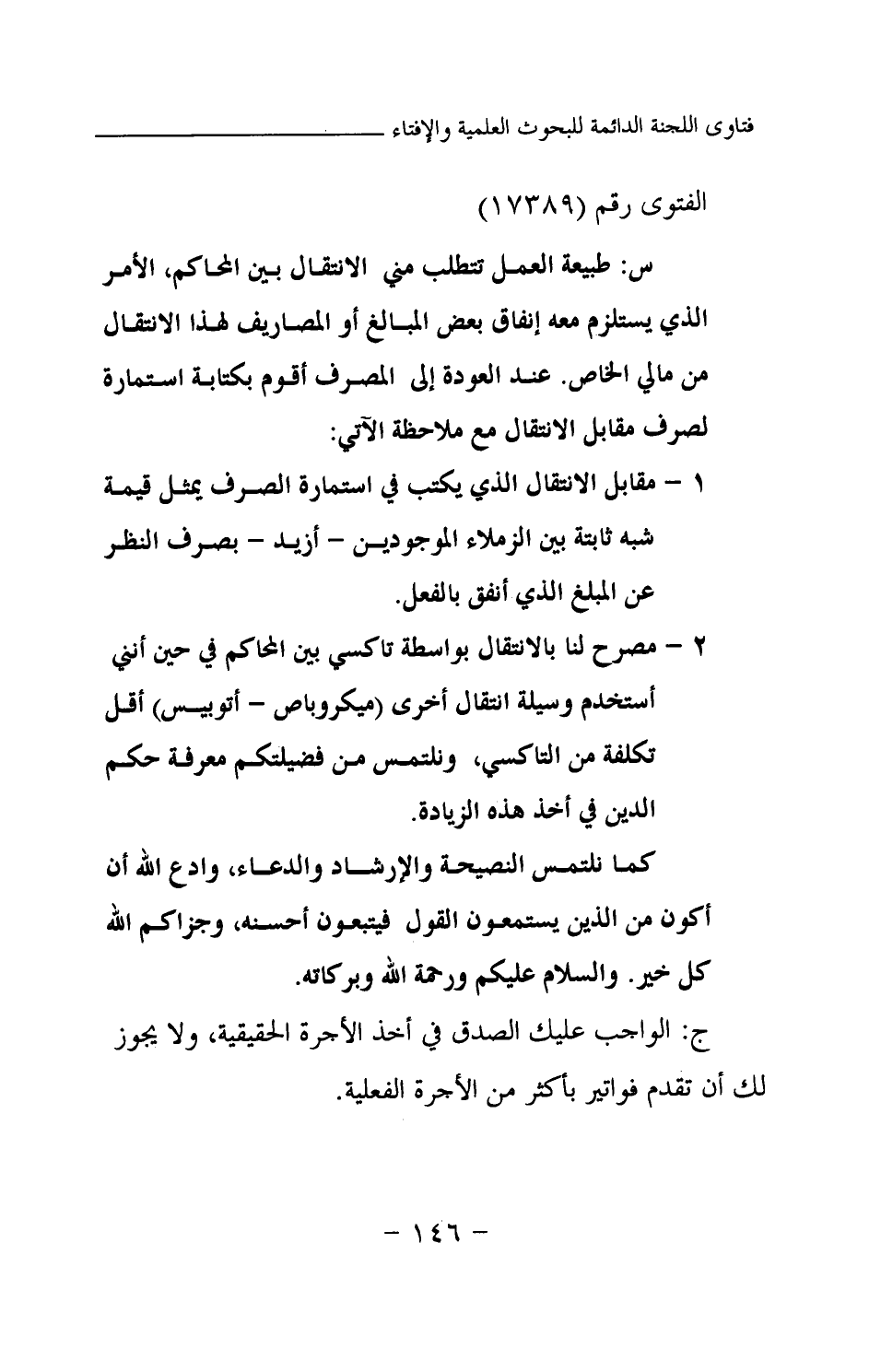 س: طبيعة العمل تتطلب مني الانتقال بين المحاكم، الأمر الذي يستلزم معه إنفاق بعض المبالغ أو المصاريف لهذا الانتقال من مالي الخاص. عند العودة إلى المصرف أقوم بكتابة استمارة لصرف مقابل الانتقال مع ملاحظة الآتي: 1- مقابل الانتقال الذي يكتب في استمارة الصرف يمثل قيمة شبه ثابتة بين الزملاء الموجودين - أزيد - بصرف النظر عن المبلغ الذي أنفق بالفعل. 2- مصرح لنا بالانتقال بواسطة تاكسي بين المحاكم في حين أنني أستخدم وسيلة انتقال أخرى (ميكروباص- أتوبيس) أقل تكلفة من التاكسي، ونلتمس من فضيلتكم معرفة حكم الدين في أخذ هذه الزيادة. كما نلتمس النصيحة والإرشاد والدعاء، وادع الله أن أكون من الذين يستمعون القول فيتبعون أحسنه، وجزاكم الله كل خير. والسلام عليكم ورحمة الله وبركاته.