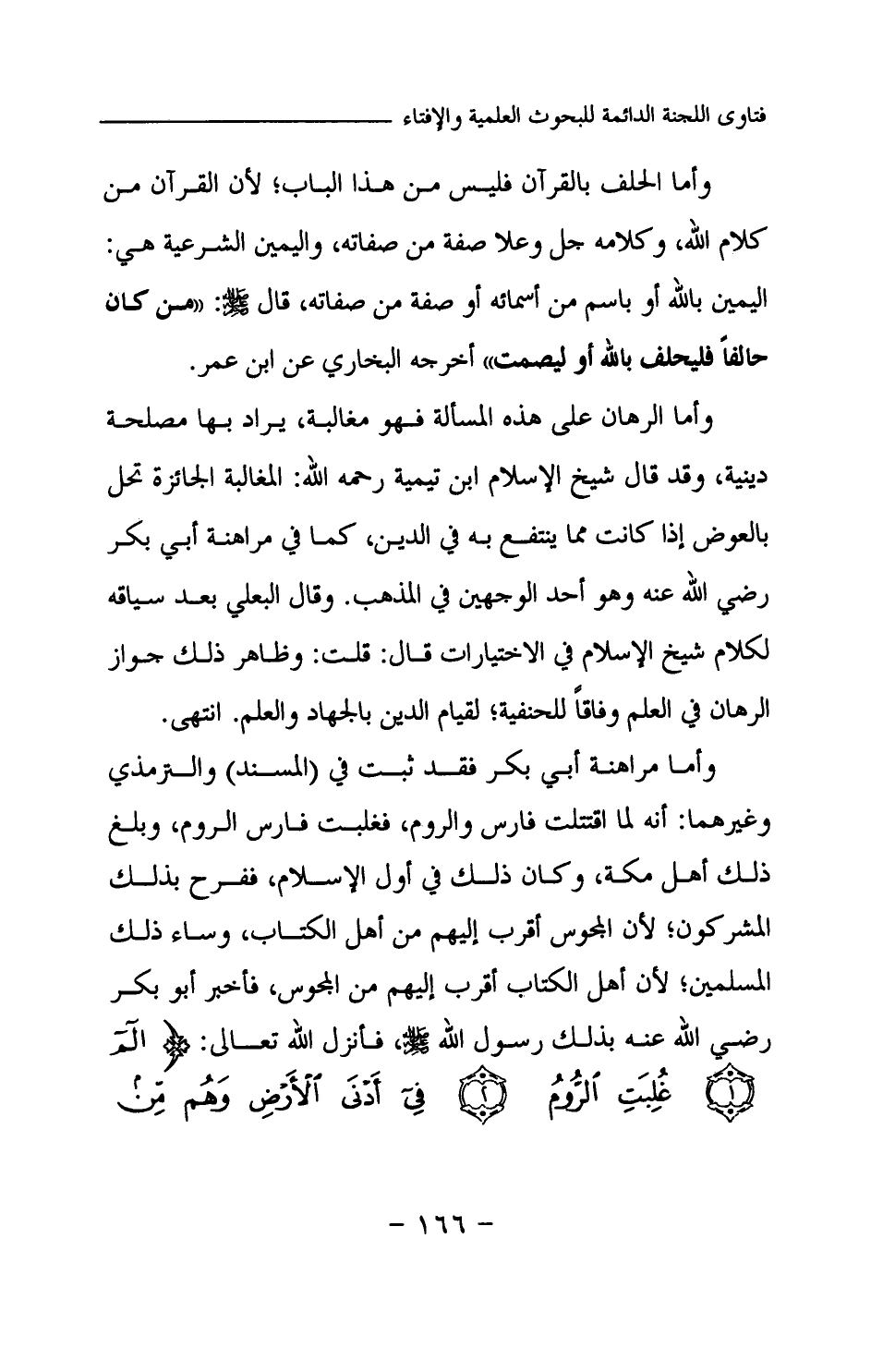 وأما الحلف بالقرآن فليس من هذا الباب؛ لأن القرآن من كلام الله، وكلامه -جل وعلا- صفة من صفاته، واليمين الشرعية هي: اليمين بالله أو باسم من أسمائه أو صفة من صفاته، قال -صلى الله عليه وسلم-: «من كان حالفا فليحلف بالله أو ليصمت (¬1) » أخرجه البخاري عن ابن عمر. وأما الرهان على هذه المسألة فهو مغالبة، يراد بها مصلحة دينية، وقد قال شيخ الإسلام ابن تيمية -رحمه الله-: (المغالبة الجائزة تحل بالعوض إذا كانت مما ينتفع به في الدين، كما في مراهنة أبي بكر -رضي الله عنه- وهو أحد الوجهين في المذهب) . وقال البعلي بعد سياقه لكلام شيخ الإسلام في الاختيارات قال: (قلت: وظاهر ذلك جواز الرهان في العلم وفاقا للحنفية؛ لقيام الدين بالجهاد والعلم) . انتهى. وأما مراهنة أبي بكر فقد ثبتت في (المسند) والترمذي وغيرهما: «أنه لما اقتتلت فارس والروم، فغلبت فارس الروم، وبلغ ذلك أهل مكة، وكان ذلك في أول الإسلام، ففرح بذلك المشركون؛ لأن المجوس أقرب إليهم من أهل الكتاب، وساء ذلك المسلمين؛ لأن أهل الكتاب أقرب إليهم من المجوس، فأخبر أبو بكر -رضي الله عنه- بذلك رسول الله -صلى الله عليه وسلم-، فأنزل الله -تعالى-: