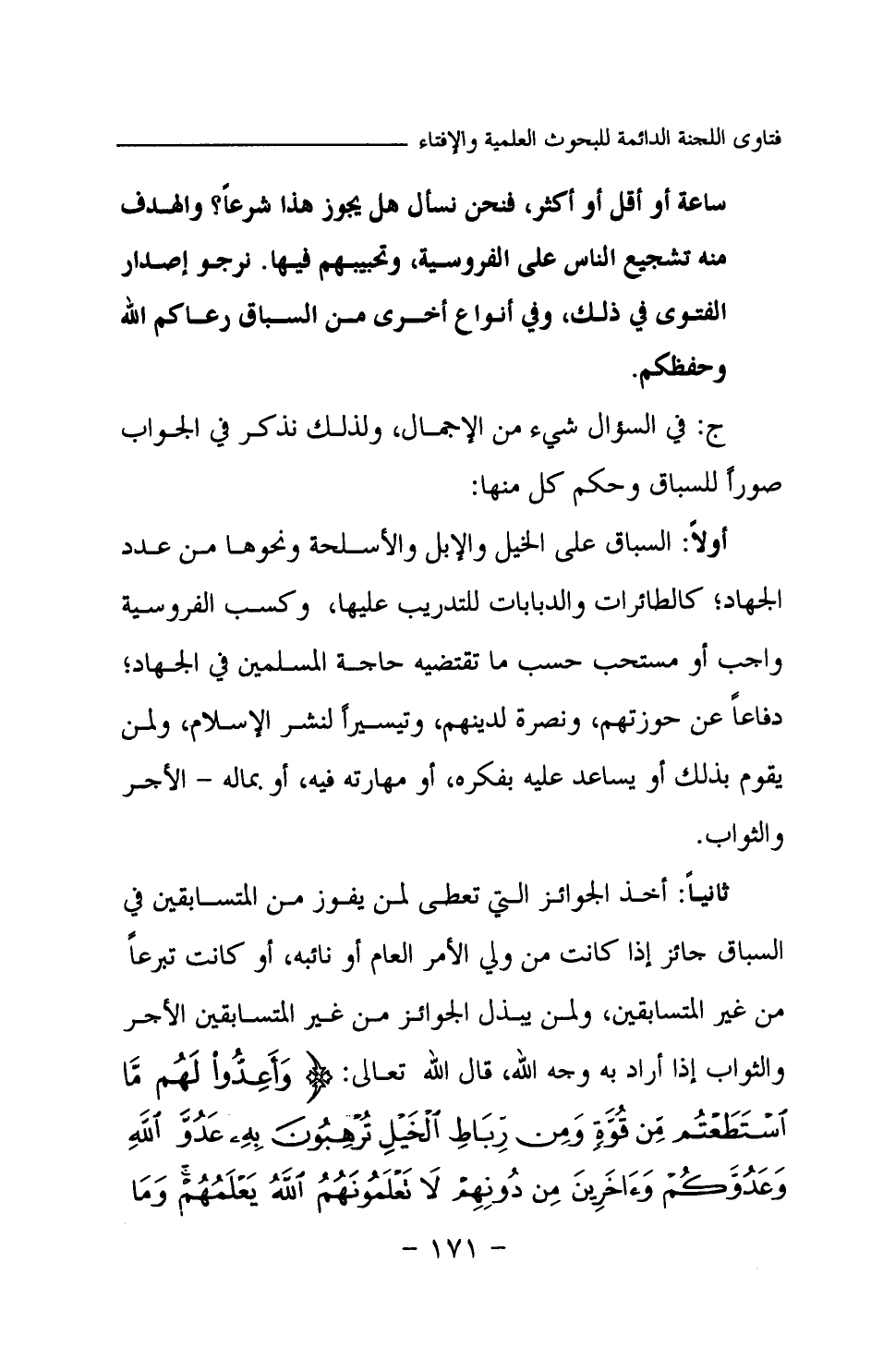 ساعة أو أقل أو أكثر، فنحن نسأل: هل يجوز هذا شرعا؟ والهدف منه تشجيع الناس على الفروسية، وتحبيبهم فيها. نرجو إصدار الفتوى في ذلك، وفي أنواع أخرى من السباق، رعاكم الله وحفظكم.