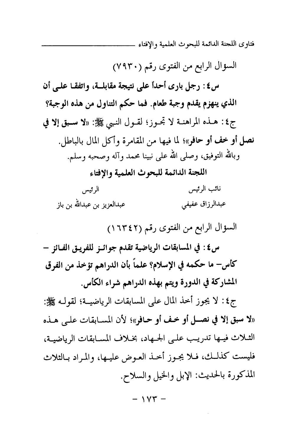 ج 4: لا يجوز أخذ المال على المسابقات الرياضية؛ لقوله -صلى الله عليه وسلم-: «لا سبق إلا في نصل أو خف أو حافر (¬1) » ؛ لأن المسابقات على هذه الثلاث فيها تدريب على الجهاد، بخلاف المسابقات الرياضية، فليست كذلك، فلا يجوز أخذ العوض عليها، والمراد بالثلاث المذكورة بالحديث: الإبل والخيل والسلاح.