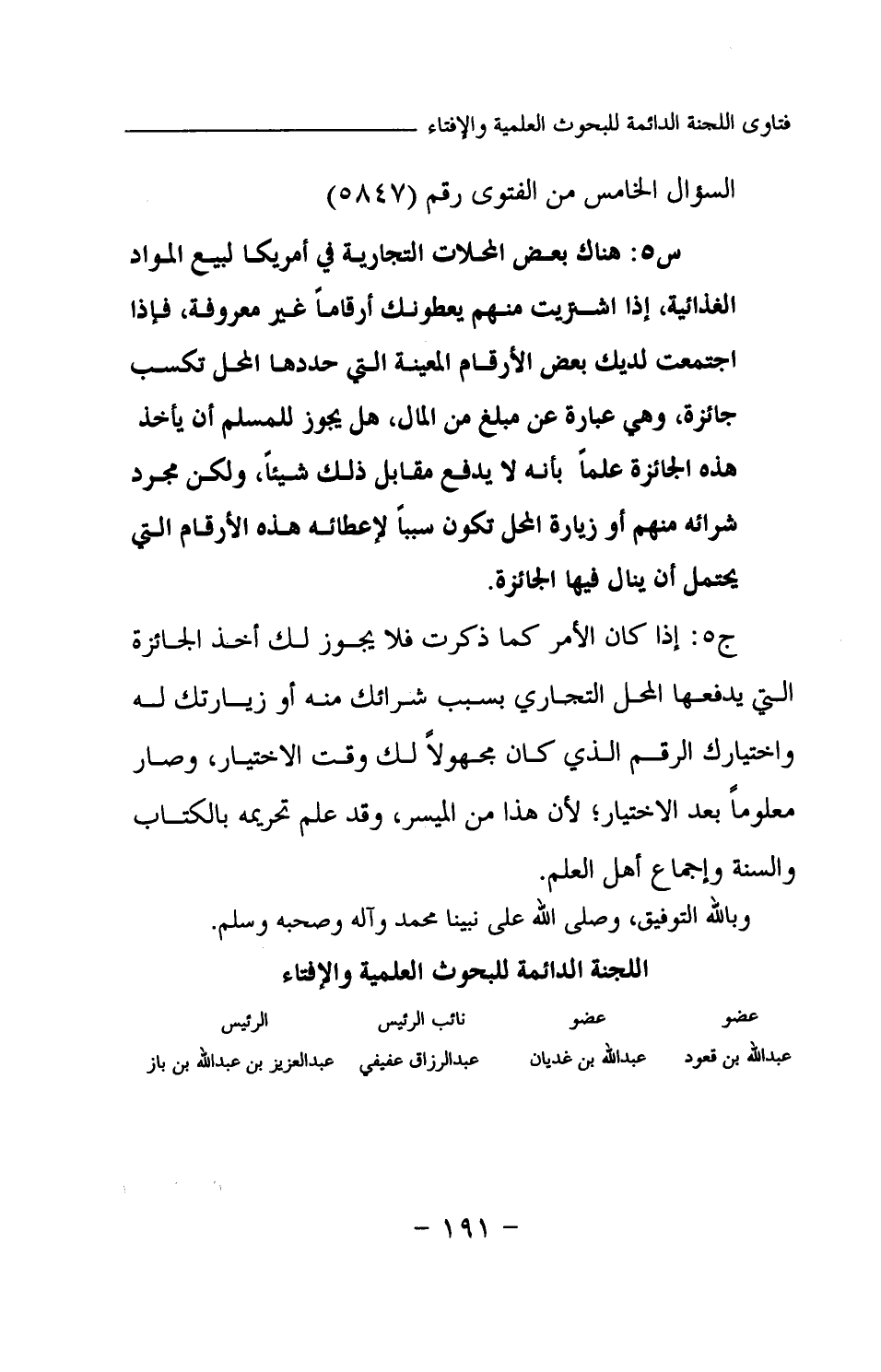 ج5: إذا كان الأمر كما ذكرت فلا يجوز لك أخذ الجائزة التي يدفعها المحل التجاري بسبب شرائك منه أو زيارتك له، واختيارك الرقم الذي كان مجهولا لك وقت الاختيار، وصار معلوما بعد الاختيار؛ لأن هذا من الميسر، وقد علم تحريمه بالكتاب والسنة وإجماع أهل العلم. وبالله التوفيق، وصلى الله على نبينا محمد وآله وصحبه وسلم.
