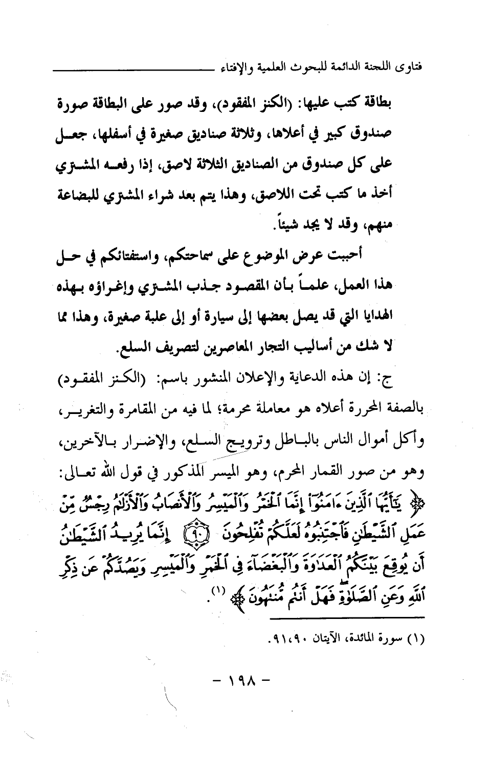 ج: إن هذه الدعاية والإعلان المنشور باسم: (الكنز المفقود) بالصفة المحررة أعلاه هو معاملة محرمة؛ لما فيه من المقامرة والتغرير، وأكل أموال الناس بالباطل وترويج السلع، والإضرار بالآخرين، وهو من صور القمار المحرم، وهو الميسر المذكور في قول الله -تعالى-: {يَا أَيُّهَا الَّذِينَ آمَنُوا إِنَّمَا الْخَمْرُ وَالْمَيْسِرُ وَالْأَنْصَابُ وَالْأَزْلَامُ رِجْسٌ مِنْ عَمَلِ الشَّيْطَانِ فَاجْتَنِبُوهُ لَعَلَّكُمْ تُفْلِحُونَ} (¬1) {إِنَّمَا يُرِيدُ الشَّيْطَانُ أَنْ يُوقِعَ بَيْنَكُمُ الْعَدَاوَةَ وَالْبَغْضَاءَ فِي الْخَمْرِ وَالْمَيْسِرِ وَيَصُدَّكُمْ عَنْ ذِكْرِ اللَّهِ وَعَنِ الصَّلَاةِ فَهَلْ أَنْتُمْ مُنْتَهُونَ} (¬2)