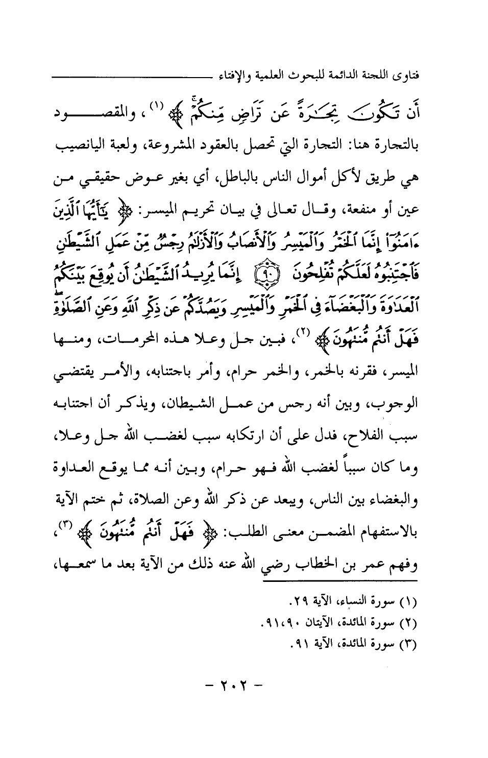 والمقصود بالتجارة هنا: التجارة التي تحصل بالعقود المشروعة، ولعبة اليانصيب هي طريق لأكل أموال الناس بالباطل، أي بغير عوض حقيقي من عين أو منفعة، وقال -تعالى- في بيان تحريم الميسر: {يَا أَيُّهَا الَّذِينَ آمَنُوا إِنَّمَا الْخَمْرُ وَالْمَيْسِرُ وَالْأَنْصَابُ وَالْأَزْلَامُ رِجْسٌ مِنْ عَمَلِ الشَّيْطَانِ فَاجْتَنِبُوهُ لَعَلَّكُمْ تُفْلِحُونَ} (¬1) {إِنَّمَا يُرِيدُ الشَّيْطَانُ أَنْ يُوقِعَ بَيْنَكُمُ الْعَدَاوَةَ وَالْبَغْضَاءَ فِي الْخَمْرِ وَالْمَيْسِرِ وَيَصُدَّكُمْ عَنْ ذِكْرِ اللَّهِ وَعَنِ الصَّلَاةِ فَهَلْ أَنْتُمْ مُنْتَهُونَ} (¬2) فبين -جل وعلا- هذه المحرمات، ومنها الميسر، فقرنه بالخمر، والخمر حرام، وأمر باجتنابه، والأمر يقتضي الوجوب، وبين أنه رجس من عمل الشيطان، ويذكر أن اجتنابه سبب الفلاح، فدل على أن ارتكابه سبب لغضب الله جل وعلا، وما كان سببا لغضب الله فهو حرام، وبين أنه مما يوقع العداوة والبغضاء بين الناس، ويبعد عن ذكر الله وعن الصلاة، ثم ختم الآية بالاستفهام المضمن معنى الطلب: {فَهَلْ أَنْتُمْ مُنْتَهُونَ} (¬3) وفهم عمر بن الخطاب -رضي الله عنه- ذلك من الآية بعد ما سمعها،