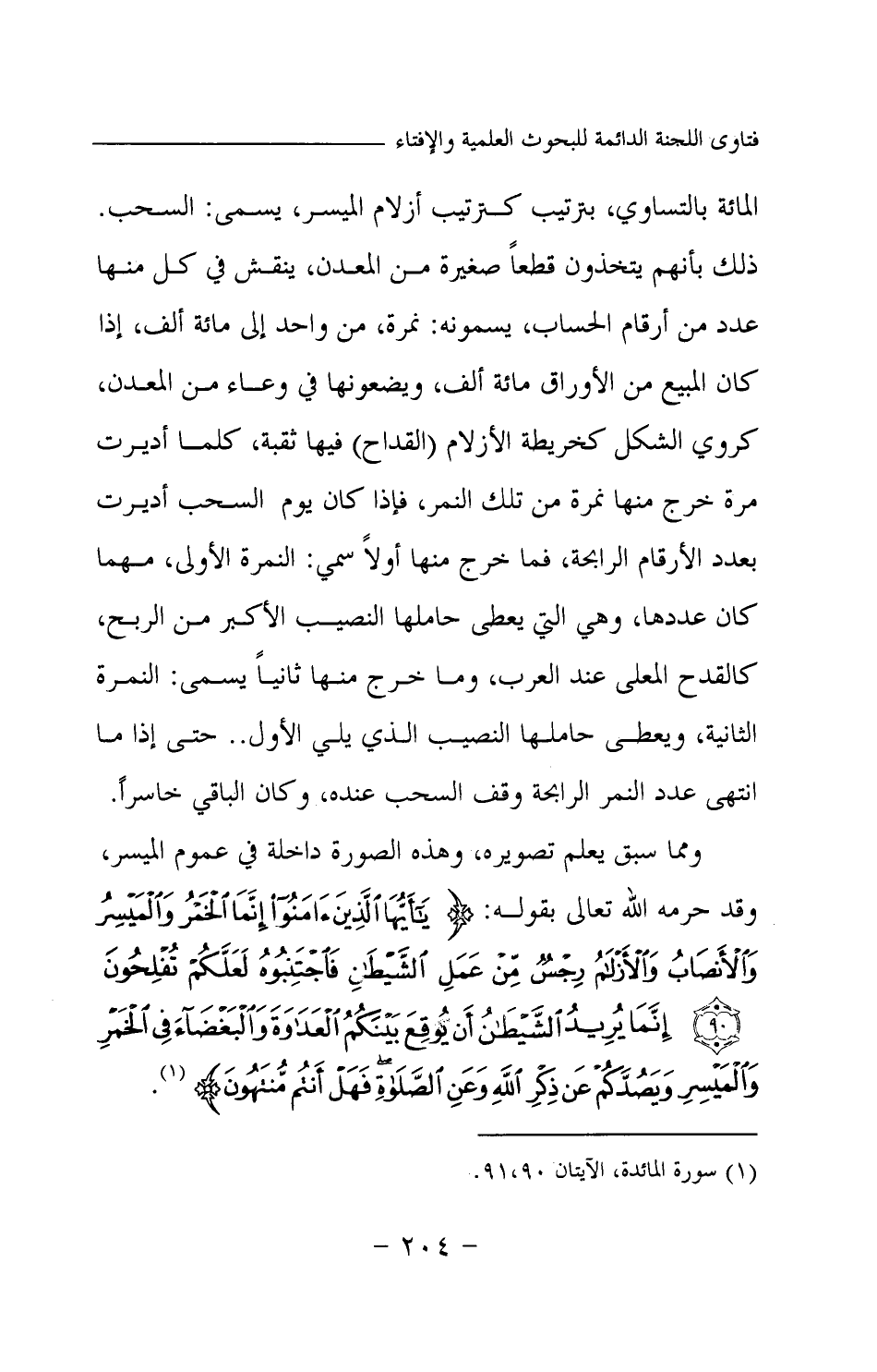 المائة بالتساوي، بترتيب كترتيب أزلام الميسر، يسمى: السحب. ذلك بأنهم يتخذون قطعا صغيرة من المعدن، ينقش في كل منها عدد من أرقام الحساب، يسمونه: نمرة، من واحد إلى مائة ألف، إذا كان المبيع من الأوراق مائة ألف، ويضعونها في وعاء من المعدن، كروي الشكل كخريطة الأزلام (القداح) فيها ثقبة، كلما أديرت مرة خرج منها نمرة من تلك النمر، فإذا كان يوم السحب أديرت بعدد الأرقام الرابحة، فما خرج منها أولا سمي: النمرة الأولى، مهما كان عددها، وهي التي يعطى حاملها النصيب الأكبر من الربح، كالقدح المعلى عند العرب، وما خرج منها ثانيا يسمى: النمرة الثانية، ويعطى حاملها النصيب الذي يلي الأول.. حتى إذا ما انتهى عدد النمر الرابحة وقف السحب عنده، وكان الباقي خاسرا. ومما سبق يعلم تصويره، وهذه الصورة داخلة في عموم الميسر، وقد حرمه الله -تعالى- بقوله: {يَا أَيُّهَا الَّذِينَ آمَنُوا إِنَّمَا الْخَمْرُ وَالْمَيْسِرُ وَالْأَنْصَابُ وَالْأَزْلَامُ رِجْسٌ مِنْ عَمَلِ الشَّيْطَانِ فَاجْتَنِبُوهُ لَعَلَّكُمْ تُفْلِحُونَ} (¬1) {إِنَّمَا يُرِيدُ الشَّيْطَانُ أَنْ يُوقِعَ بَيْنَكُمُ الْعَدَاوَةَ وَالْبَغْضَاءَ فِي الْخَمْرِ وَالْمَيْسِرِ وَيَصُدَّكُمْ عَنْ ذِكْرِ اللَّهِ وَعَنِ الصَّلَاةِ فَهَلْ أَنْتُمْ مُنْتَهُونَ} (¬2)