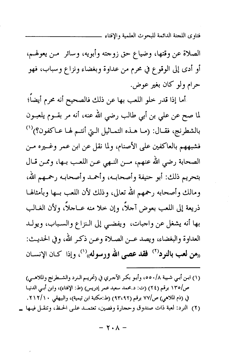 الصلاة عن وقتها، وضياع حق زوجته وأبويه، وسائر من يعولهم، أو أدى إلى الوقوع في محرم من عداوة وبغضاء ونزاع وسباب، فهو حرام ولو كان بغير عوض. أما إذا قدر خلو اللعب بها عن ذلك، فالصحيح أنه محرم أيضا؛ لما صح عن علي بن أبي طالب رضي الله عنه، أنه مر بقوم يلعبون بالشطرنج، فقال: ما هذه التماثيل التي أنتم لها عاكفون؟ فشبههم بالعاكفين على الأصنام، ولما نقل عن ابن عمر وغيره من الصحابة رضي الله عنهم، من النهي عن اللعب بها، وممن قال بتحريم ذلك: أبو حنيفة وأصحابه، وأحمد وأصحابه رحمهم الله، ومالك وأصحابه رحمهم الله تعالى، وذلك لأن اللعب بها وبأمثالها ذريعة إلى اللعب بعوض آجلا، وإن خلا منه عاجلا، ولأن الغالب بها أنه يشغل عن واجبات، ويفضي إلى النزاع والسباب، ويولد العداوة والبغضاء، ويصد عن الصلاة وعن ذكر الله، وفي الحديث: «من لعب بالنرد (¬2) » وإذا كان الإنسان