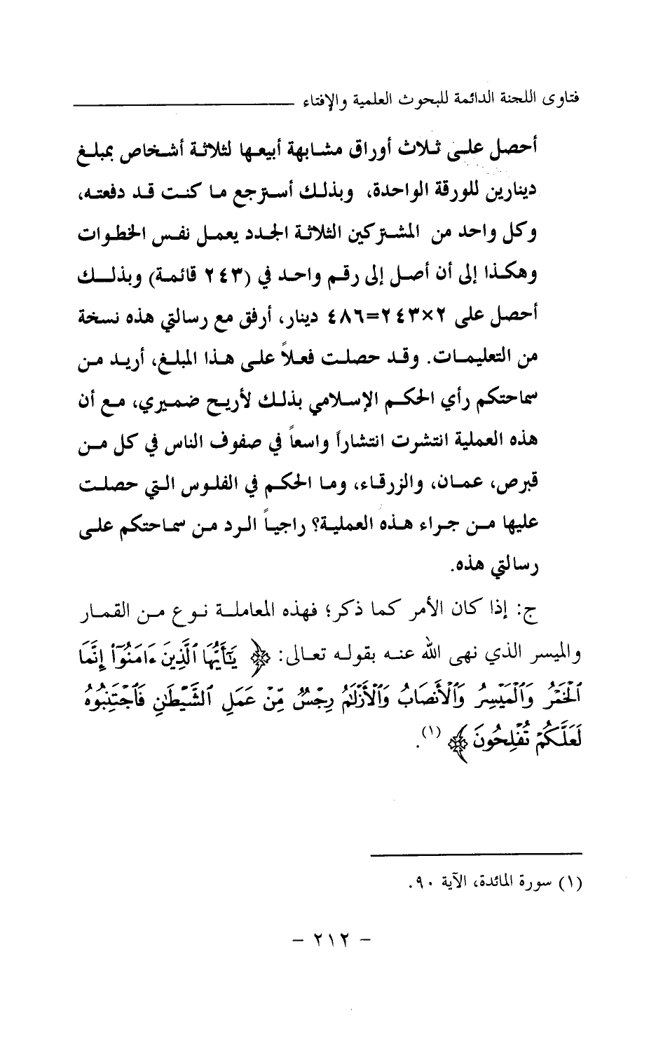 أحصل على ثلاث أوراق مشابهة أبيعها لثلاثة أشخاص بمبلغ دينارين للورقة الواحدة، وبذلك أسترجع ما كنت قد دفعته، وكل واحد من المشتركين الثلاثة الجدد يعمل نفس الخطوات وهكذا إلى أن أصل إلى رقم واحد في (243 قائمة) وبذلك أحصل على 2 × 243 = 486 دينار، أرفق مع رسالتي هذه نسخة من التعليمات. وقد حصلت فعلا على هذا المبلغ، أريد من سماحتكم رأي الحكم الإسلامي بذلك لأريح ضميري، مع أن هذه العملية انتشرت انتشارا واسعا في صفوف الناس في كل من قبرص عمان والزرقاء وما الحكم في الفلوس التي حصلت عليها من جراء هذه العملية؟ راجيا الرد من سماحتكم على رسالتي هذه.