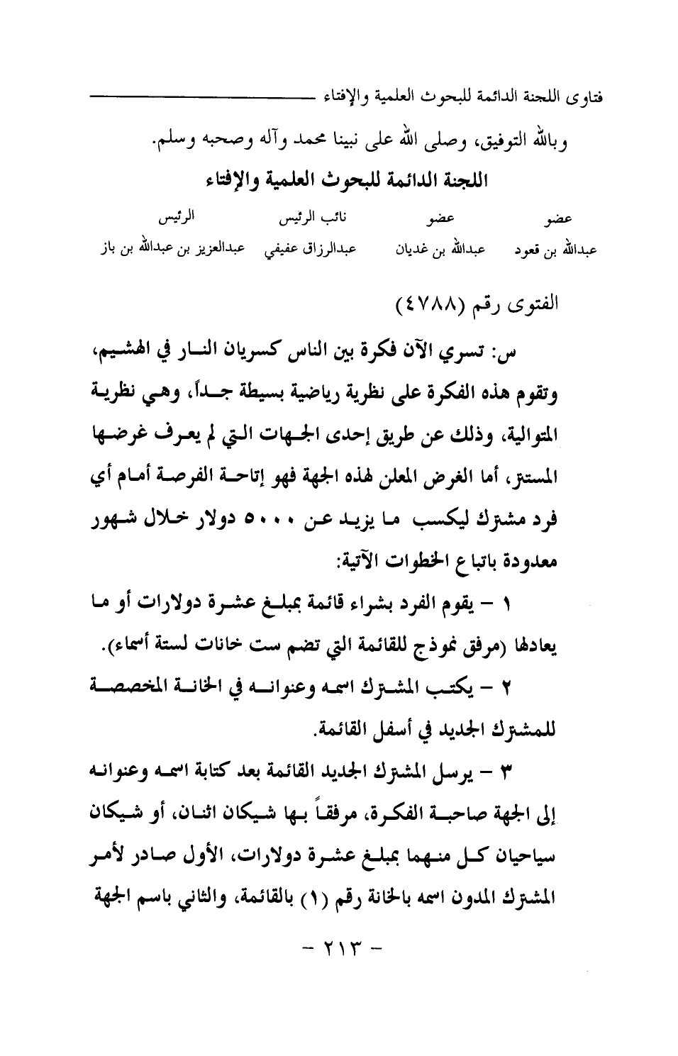 س: تسري الآن فكرة بين الناس كسريان النار في الهشيم، وتقوم هذه الفكرة على نظرية رياضية بسيطة جدا، وهي نظرية المتوالية، وذلك عن طريق إحدى الجهات التي لم يعرف غرضها المستتر، أما الغرض المعلن لهذه الجهة فهو إتاحة الفرصة أمام أي فرد مشترك ليكسب ما يزيد عن 5000 دولار خلال شهور معدودة باتباع الخطوات الآتية: 1- يقوم الفرد بشراء قائمة بمبلغ عشرة دولارات أو ما يعادلها (مرفق نموذج للقائمة التي تضم ست خانات لستة أسماء) . 2- يكتب المشترك اسمه وعنوانه في الخانة المخصصة للمشترك الجديد في أسفل القائمة. 3- يرسل المشترك الجديد القائمة بعد كتابة اسمه وعنوانه إلى الجهة صاحبة الفكرة، مرفقا بها شيكان اثنان، أو شيكان سياحيان كل منهما بمبلغ عشرة دولارات، الأول صادر لأمر المشترك المدون اسمه بالخانة رقم (1) بالقائمة، والثاني باسم الجهة