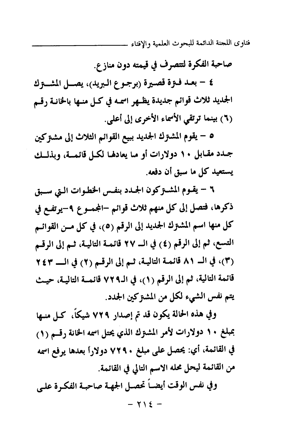 صاحبة الفكرة لتتصرف في قيمته دون منازع. 4- بعد فترة قصيرة (برجوع البريد) ، يصل المشترك الجديد ثلاث قوائم جديدة يظهر اسمه في كل منها بالخانة رقم (6) بينما تبقى الأسماء الأخرى إلى أعلى. 5- يقوم المشترك الجديد ببيع القوائم الثلاث إلى مشتركين جدد مقابل 10 دولارات أو ما يعادلها لكل قائمة، وبذلك يستعيد كل ما سبق أن دفعه. 6- يقوم المشتركون الجدد بنفس الخطوات التي سبق ذكرها، فتصل إلى كل منهم ثلاث قوائم -المجموع 9- يرتفع في كل منها اسم المشترك الجديد إلى الرقم (5) ، في كل من القوائم التسع، ثم إلى الرقم (4) في الـ 27 قائمة التالية، ثم إلى الرقم (3) في الـ 81 قائمة التالية، ثم إلى الرقم (2) في الـ 243 قائمة التالية، ثم إلى الرقم (1) ، في الـ 729 قائمة التالية، حيث يتم نفس الشيء لكل من المشتركين الجدد. وفي هذه الحالة يكون قد تم إصدار 729 شيكا، كل منها بمبلغ 10 دولارات لأمر المشترك الذي يحتل اسمه الخانة رقم (1) في القائمة، أي: يحصل على مبلغ 7290 دولارا بعدها يرفع اسمه من القائمة ليحل محله الاسم التالي في القائمة. وفي نفس الوقت أيضا تحصل الجهة صاحبة الفكرة على