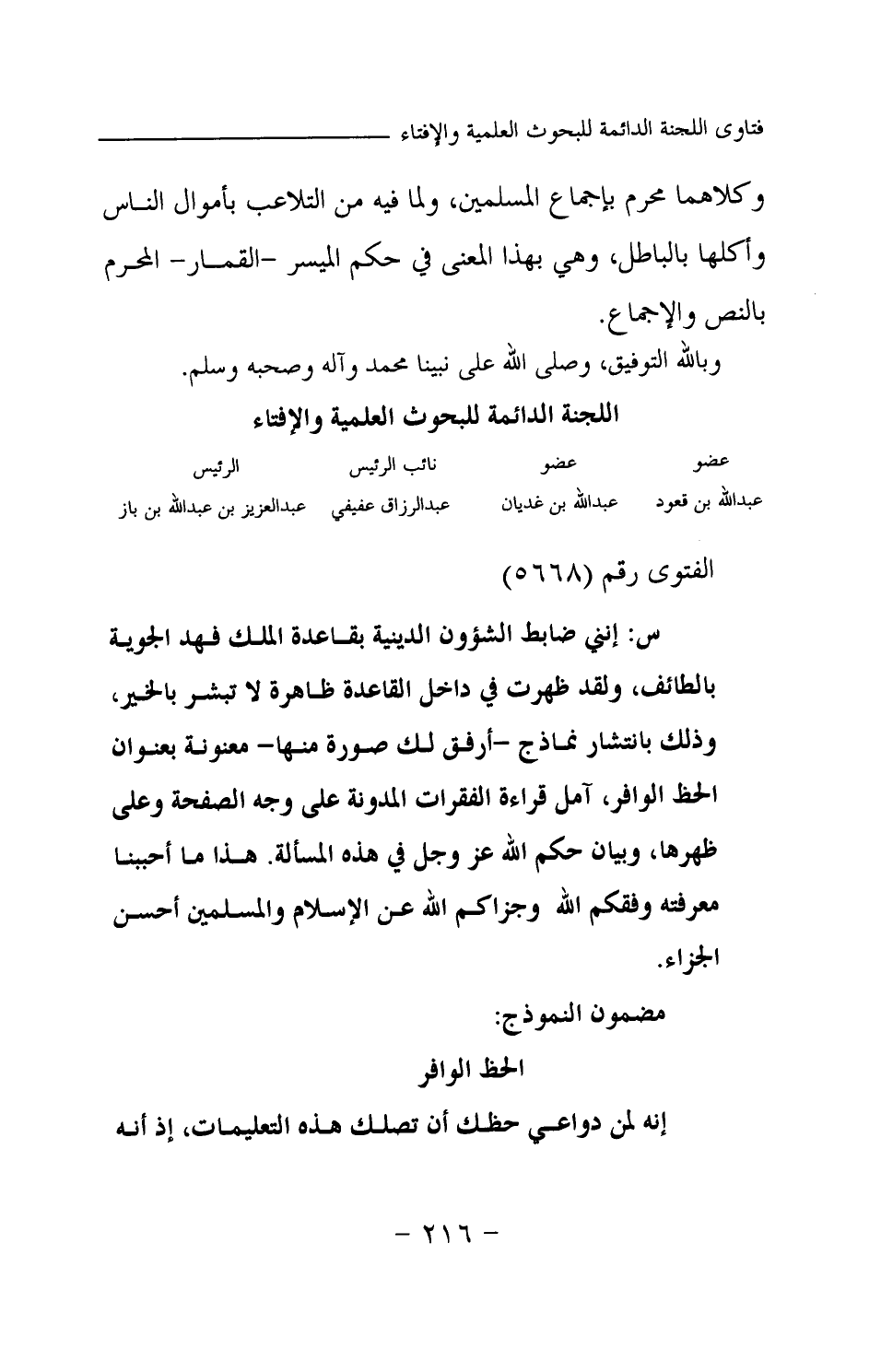 س: إنني ضابط الشؤون الدينية بقاعدة الملك فهد الجوية بالطائف ولقد ظهرت في داخل القاعدة ظاهرة لا تبشر بالخير، وذلك بانتشار نماذج -أرفق لك صورة منها- معنونة بعنوان الحظ الوافر، آمل قراءة الفقرات المدونة على وجه الصفحة وعلى ظهرها، وبيان حكم الله عز وجل في هذه المسألة. هذا ما أحببنا معرفته، وفقكم الله وجزاكم الله عن الإسلام والمسلمين أحسن الجزاء. مضمون النموذج: الحظ الوافر إنه لمن في واعي حظك أن تصلك هذه التعليمات، إذ أنه
