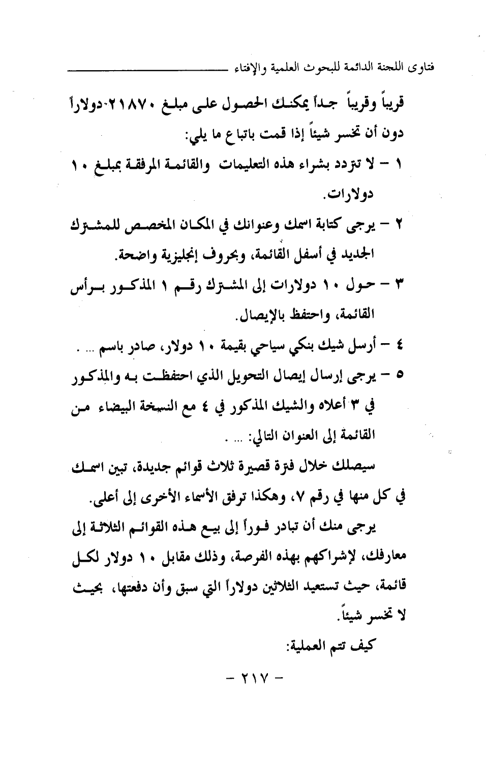 قريبا وقريبا جدا يمكنك الحصول على مبلغ 21870 دولارا دون أن تخسر شيئا إذا قمت باتباع ما يلي: 1- لا تتردد بشراء هذه التعليمات والقائمة المرفقة بمبلغ 10 دولارات. 2- يرجى كتابة اسمك وعنوانك في المكان المخصص للمشترك الجديد في أسفل القائمة، وبحروف إنجليزية واضحة. 3- حول 10 دولارات إلى المشترك رقم 1 المذكور برأس القائمة، واحتفظ بالإيصال. 4- أرسل شيك بنكي سياحي بقيمة 10 دولار، صادر باسم.... 5- يرجى إرسال إيصال التحويل الذي احتفظت به والمذكور في 3 أعلاه والشيك المذكور في 4 مع النسخة البيضاء من القائمة إلى العنوان التالي:.... سيصلك خلال فترة قصيرة ثلاث قوائم جديدة، تبين اسمك في كل منها في رقم 7، وهكذا ترفق الأسماء الأخرى إلى أعلى. يرجى منك أن تبادر فورا إلى بيع هذه القوائم الثلاثة إلى معارفك، لإشراكهم بهذه الفرصة، وذلك مقابل 10 دولار لكل قائمة، حيث تستعيد الثلاثين دولارا التي سبق وأن دفعتها، بحيث لا تخسر شيئا. كيف تتم العملية: