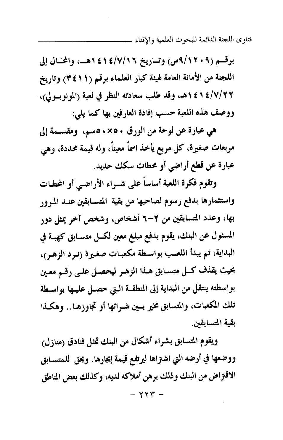 برقم (1209 \ 9 س) وتاريخ 16 \ 7 \ 1414 هـ، والمحال إلى اللجنة من الأمانة العامة لهيئة كبار العلماء برقم (3411) وتاريخ 22 \ 7 \ 1414 هـ، وقد طلب سعادته النظر في لعبة (المونوبولي) ، ووصف هذه اللعبة حسب إفادة العارفين بها كما يلي: هي عبارة عن لوحة من الورق 50 × 50 سم، ومقسمة إلى مربعات صغيرة، كل مربع يأخذ اسما معينا، وله قيمة محددة، وهي عبارة عن قطع أراضي أو محطات سكك حديد. وتقوم فكرة اللعبة أساسا على شراء الأراضي أو المحطات واستثمارها بدفع رسوم لصاحبها من بقية المتسابقين عند المرور بها، وعدد المتسابقين من 2-6 أشخاص، وشخص آخر يمثل دور المسئول عن البنك، يقوم بدفع مبلغ معين لكل متسابق كهبة في البداية، ثم يبدأ اللعب بواسطة مكعبات صغيرة (نرد الزهر) ، بحيث يقذف كل متسابق هذا الزهر ليحصل على رقم معين بواسطته ينتقل من البداية إلى المنطقة التي حصل عليها بواسطة تلك المكعبات، والمتسابق مخير بين شرائها أو تجاوزها.. وهكذا بقية المتسابقين. ويقوم المتسابق بشراء أشكال من البنك تمثل فنادق (منازل) ووضعها في أرضه التي اشتراها ليرتفع قيمة إيجارها. ويحق للمتسابق الاقتراض من البنك وذلك برهن أملاكه لديه، وكذلك بعض المناطق