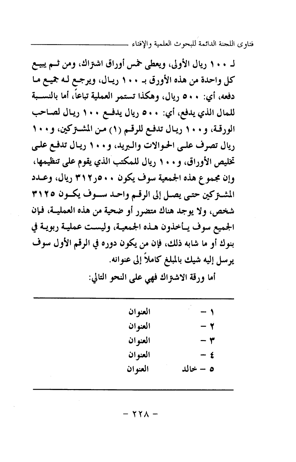 لـ 100 ريال الأولى، ويعطى خمس أوراق اشتراك، ومن ثم يبيع كل واحدة من هذه الأوراق بـ 100 ريال، وبرجع له جميع ما دفعه، أي: 500 ريال، وهكذا تستمر العملية تباعا، أما بالنسبة للمال الذي يدفع، أي: 500 ريال يدفع 155 ريال لصاحب الورقة، و100 ريال تدفع للرقم (1) من المشتركين، و100 ريال تصرف على الحوالات والبريد، و100 ريال تدفع على تخليص الأوراق، و100 ريال للمكتب الذي يقوم على تنظيمها، وإن مجموع هذه الجمعية سوف يكون500، 312 ريال، وعدد المشتركين حتى يصل إلى الرقم واحد سوف يكون 3125 شخص، ولا يوجد هناك متضرر أو ضحية من هذه العملية، فإن الجميع سوف يأخذون هذه الجمعية، وليست عملية ربوية في بنوك أو ما شابه ذلك، فإن من يكون دوره في الرقم الأول سوف يرسل إليه شيك بالمبلغ كاملا إلى عنوانه. أما ورقة الاشتراك فهي على النحو التالي: