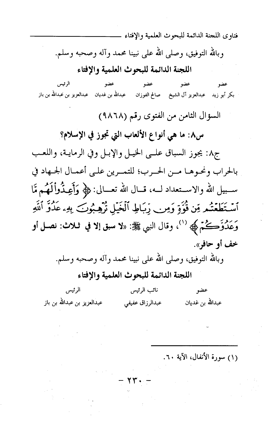 ج8: يجوز السباق على الخيل والإبل وفي الرماية، واللعب بالحراب ونحوها من الحرب؛ للتمرين على أعمال الجهاد في سبيل الله والاستعداد له، قال الله تعالى: {وَأَعِدُّوا لَهُمْ مَا اسْتَطَعْتُمْ مِنْ قُوَّةٍ وَمِنْ رِبَاطِ الْخَيْلِ تُرْهِبُونَ بِهِ عَدُوَّ اللَّهِ وَعَدُوَّكُمْ} (¬1) وقال النبي -صلى الله عليه وسلم-: «لا سبق إلا في ثلاث: نصل أو خف أو حافر (¬2) » . وبالله التوفيق، وصلى الله على نبينا محمد وآله وصحبه وسلم.