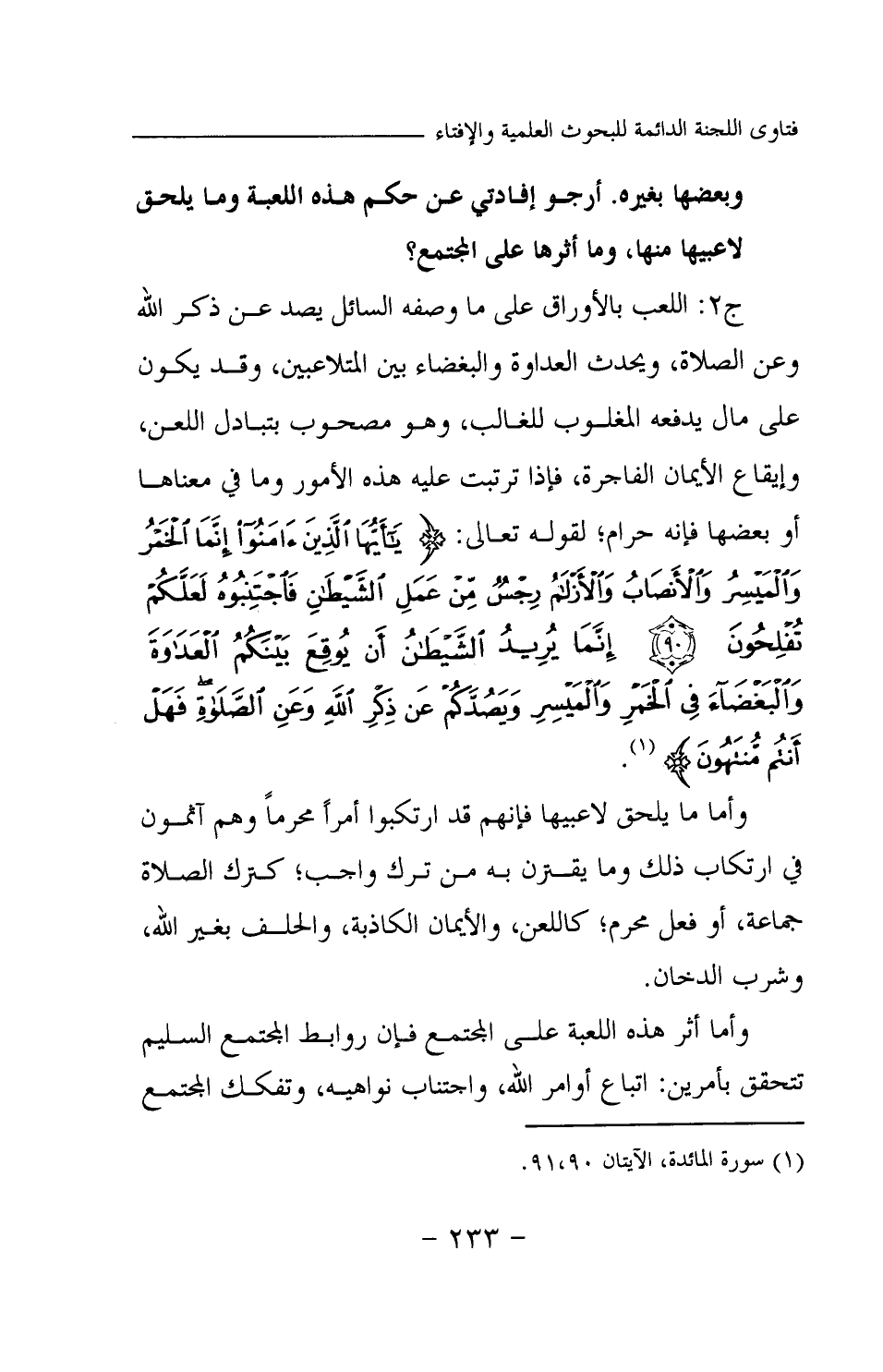 ج2: اللعب بالأوراق على ما وصفه السائل يصد عن ذكر الله وعن الصلاة، ويحدث العداوة والبغضاء بين المتلاعبين، وقد يكون على مال يدفعه المغلوب للغالب، وهو مصحوب بتبادل اللعن، وإيقاع الأيمان الفاجرة، فإذا ترتبت عليه هذه الأمور وما في معناها أو بعضها فإنه حرام؛ لقوله تعالى: {يَا أَيُّهَا الَّذِينَ آمَنُوا إِنَّمَا الْخَمْرُ وَالْمَيْسِرُ وَالْأَنْصَابُ وَالْأَزْلَامُ رِجْسٌ مِنْ عَمَلِ الشَّيْطَانِ فَاجْتَنِبُوهُ لَعَلَّكُمْ تُفْلِحُونَ} (¬1) {إِنَّمَا يُرِيدُ الشَّيْطَانُ أَنْ يُوقِعَ بَيْنَكُمُ الْعَدَاوَةَ وَالْبَغْضَاءَ فِي الْخَمْرِ وَالْمَيْسِرِ وَيَصُدَّكُمْ عَنْ ذِكْرِ اللَّهِ وَعَنِ الصَّلَاةِ فَهَلْ أَنْتُمْ مُنْتَهُونَ} (¬2) وأما ما يلحق لاعبيها فإنهم قد ارتكبوا أمرا محرما وهم آثمون في ارتكاب ذلك وما يقترن به من ترك واجب، كترك الصلاة جماعة، أو فعل محرم: كاللعن، والأيمان الكاذبة، والحلف بغير الله، وشرب الدخان. وأما أثر هذه اللعبة على المجتمع فإن روابط المجتمع السليم تتحقق بأمرين: اتباع أوامر الله، واجتناب نواهيه. وتفكك المجتمع