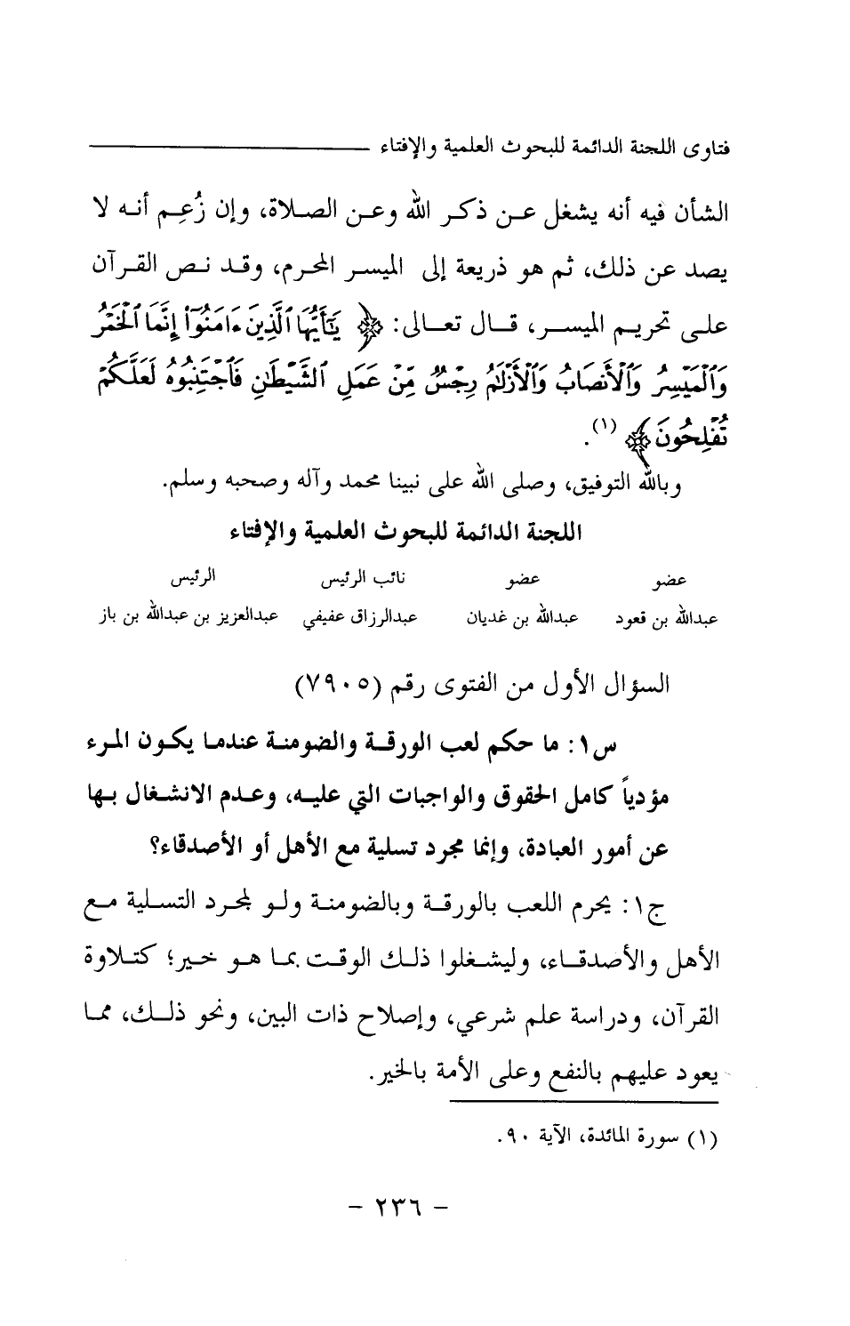 الشأن فيه أنه يشغل عن ذكر الله وعن الصلاة، وإن زعم أنه لا يصد عن ذلك، ثم هو ذريعة إلى الميسر المحرم، وقد نص القران على تحريم الميسر، قال تعالى: {يَا أَيُّهَا الَّذِينَ آمَنُوا إِنَّمَا الْخَمْرُ وَالْمَيْسِرُ وَالْأَنْصَابُ وَالْأَزْلَامُ رِجْسٌ مِنْ عَمَلِ الشَّيْطَانِ فَاجْتَنِبُوهُ لَعَلَّكُمْ تُفْلِحُونَ} (¬1) . وبالله التوفيق، وصلى الله على نبينا محمد وآله وصحبه وسلم.