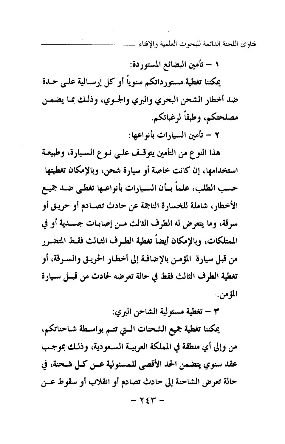 1 - تأمين البضائع المستوردة: يمكننا تغطية مستورداتكم سنويا أو كل إرسالية على حدة ضد أخطار الشحن البحري والبري والجوي، وذلك بما يضمن مصلحتكم، وطبقا لرغباتكم. تأمين السيارات بأنواعها: هذا النوع من التأمين يتوقف على نوع السيارة وطبيعة استخدامها، إن كانت خاصة أو سيارة شحن، وبالإمكان تغطيتها حسب الطلب، علما بأن السيارات بأنواعها تغطى ضد جميع الأخطار، شاملة للخسارة الناجمة عن حادث تصادم أو حريق أو سرقة، وما يتعرض له الطرف الثالث من إصابات جسدية أو في الممتلكات، وبالإمكان أيضا تغطية الطرف الثالث فقط المتضرر من قبل سيارة المؤمن بالإضافة إلى أخطار الحريق والسرقة، أو تغطية الطرف الثالث فقط في حالة تعرضه لحادث من قبل سيارة المؤمن. 3- تغطية مسئولية الشاحن البري: يمكننا تغطية جميع الشحنات التي تتم بواسطة شاحناتكم، من وإلى أي منطقة في المملكة العربية السعودية وذلك بموجب عقد سنوي يتضمن الحد الأقصى للمسئولية عن كل شحنة، في حالة تعرض الشاحنة إلى حادث تصادم أو انقلاب أو سقوط عن
