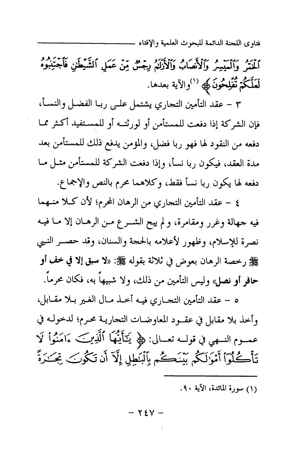 والآية بعدها. 3 - عقد التأمين التجاري يشتمل على ربا الفضل والنسأ، فإن الشركة إذا دفعت للمستأمن أو لورثته أو للمستفيد أكثر مما دفعه من النقود لها فهو ربا فضل، والمؤمن يدفع ذلك للمستأمن بعد مدة العقد، فيكون ربا نسأ، وإذا دفعت الشركة للمستأمن مثلما دفعه لها يكون ربا نسأ فقط، وكلاهما محرم بالنص والإجماع. 4 - عقد التأمين التجاري من الرهان المحرم؛ لأن كلا منهما فيه جهالة وغرر ومقامرة، ولم يبح الشرع من الرهان إلا ما فيه نصرة للإسلام، وظهور لأعلامه بالحجة والسنان، وقد حصر النبي -صلى الله عليه وسلم- رخصة الرهان بعوض في ثلاثة بقوله -صلى الله عليه وسلم-: «لا سبق إلا في خف أو حافر أو نصل (¬1) » وليس التأمين من ذلك، ولا شبيها به، فكان محرما. 5 - عقد التأمين التجاري فيه أخذ مال الغير بلا مقابل، وأخذ بلا مقابل في عقود المعاوضات التجارية محرم؛ لدخوله في عموم النهي في قوله تعالى: {يَا أَيُّهَا الَّذِينَ آمَنُوا لَا تَأْكُلُوا أَمْوَالَكُمْ بَيْنَكُمْ بِالْبَاطِلِ إِلَّا أَنْ تَكُونَ تِجَارَةً عَنْ تَرَاضٍ مِنْكُمْ} (¬2)