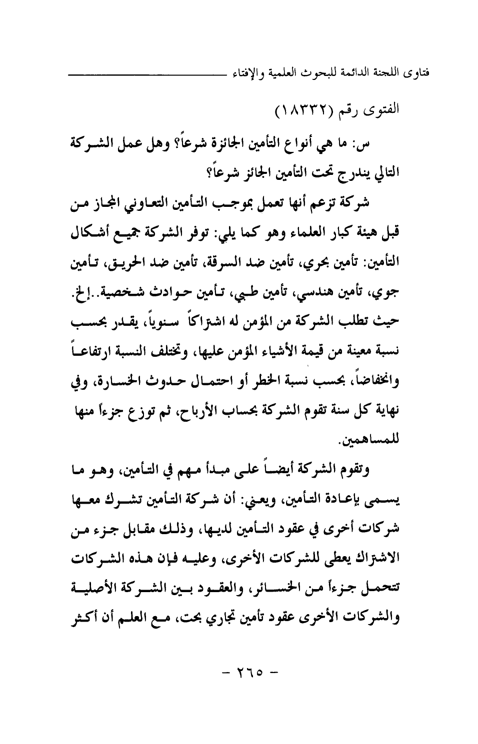 س: ما هي أنواع التأمين الجائزة شرعا؟ وهل عمل الشركة التالي يندرج تحت التأمين الجائز شرعا؟ شركة تزعم أنها تعمل بموجب التأمين التعاوني المجاز من قبل هيئة كبار العلماء وهو كما يلي: توفر الشركة جميع أشكال التأمين: تأمين بحري، تأمين ضد السرقة، تأمين ضد الحريق، تأمين جوي، تأمين هندسي، تأمين طبي، تأمين حوادث شخصية.. إلخ. حيث تطلب الشركة من المؤمن له اشتراكا سنويا، يقدر بحسب نسبة معينة من قيمة الأشياء المؤمن عليها، وتختلف النسبة ارتفاعا وانخفاضا، بحسب نسبة الخطر أو احتمال حدوث الخسارة، وفي نهاية كل سنة تقوم الشركة بحساب الأرباح، ثم توزع جزءا منها للمساهمين. وتقوم الشركة أيضا على مبدأ مهم في التأمين، وهو ما يسمى بإعادة التأمين، ويعني: أن شركة التأمين تشرك معها شركات أخرى في عقود التأمين لديها، وذلك مقابل جزء من الاشتراك يعطى للشركات الأخرى، وعليه فإن هذه الشركات تتحمل جزءا من الخسائر، والعقود بين الشركة الأصلية والشركات الأخرى عقود تأمين تجاري بحت، مع العلم أن أكثر