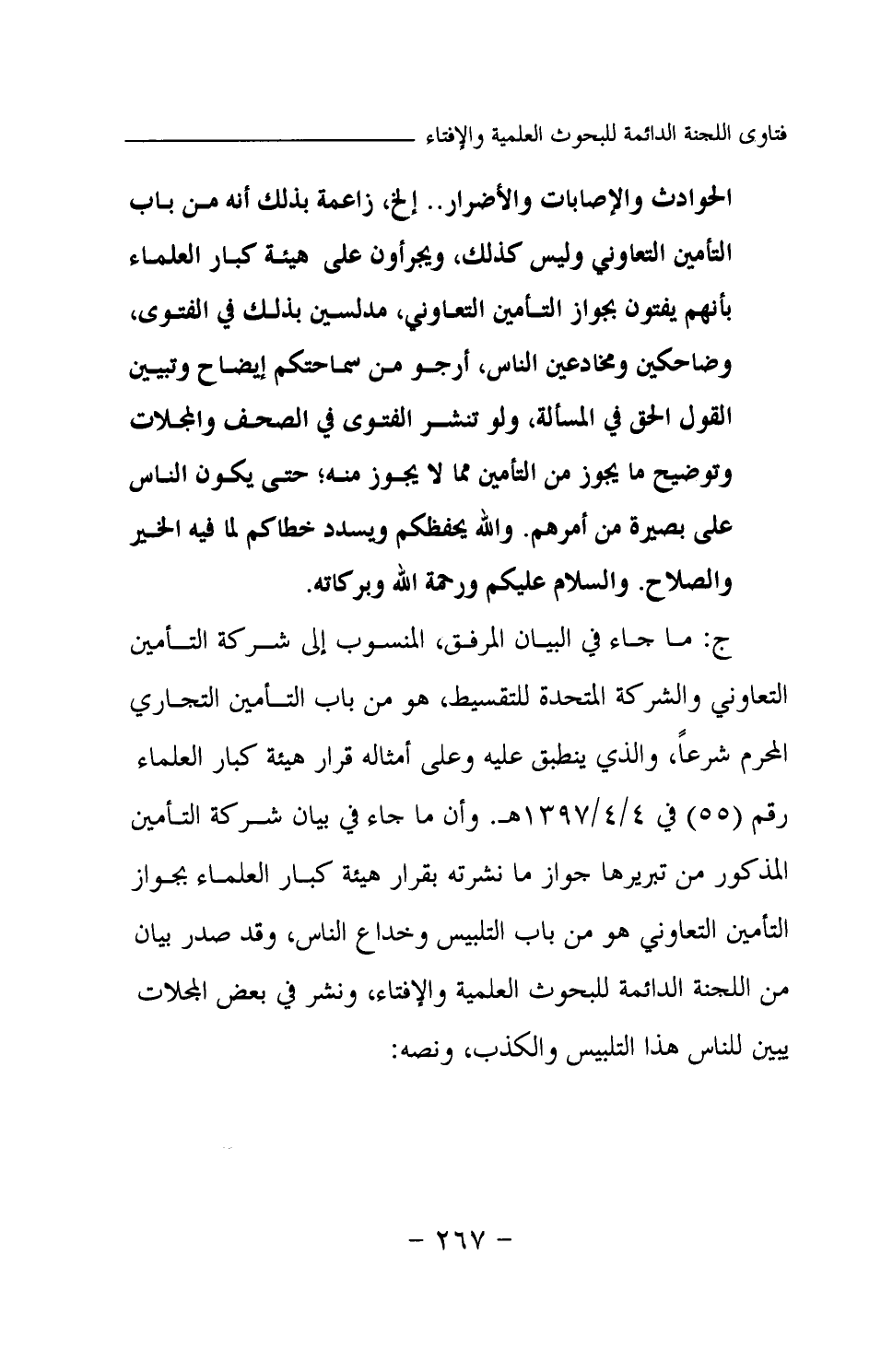الحوادث والإصابات والأضرار.. إلخ، زاعمة بذلك أنه من باب التأمين التعاوني وليس كذلك، ويجرؤون على هيئة كبار العلماء بأنهم يفتون بجواز التأمين التعاوني، مدلسين بذلك في الفتوى، وضاحكين ومخادعين الناس، أرجو من سماحتكم إيضاح وتبيين القول الحق في المسألة، ولو تنشر الفتوى في الصحف والمجلات وتوضيح ما يجوز من التأمين مما لا يجوز منه؛ حتى يكون الناس على بصيرة من أمرهم. والله يحفظكم ويسدد خطاكم لما فيه الخير والصلاح. والسلام عليكم ورحمة الله وبركاته.