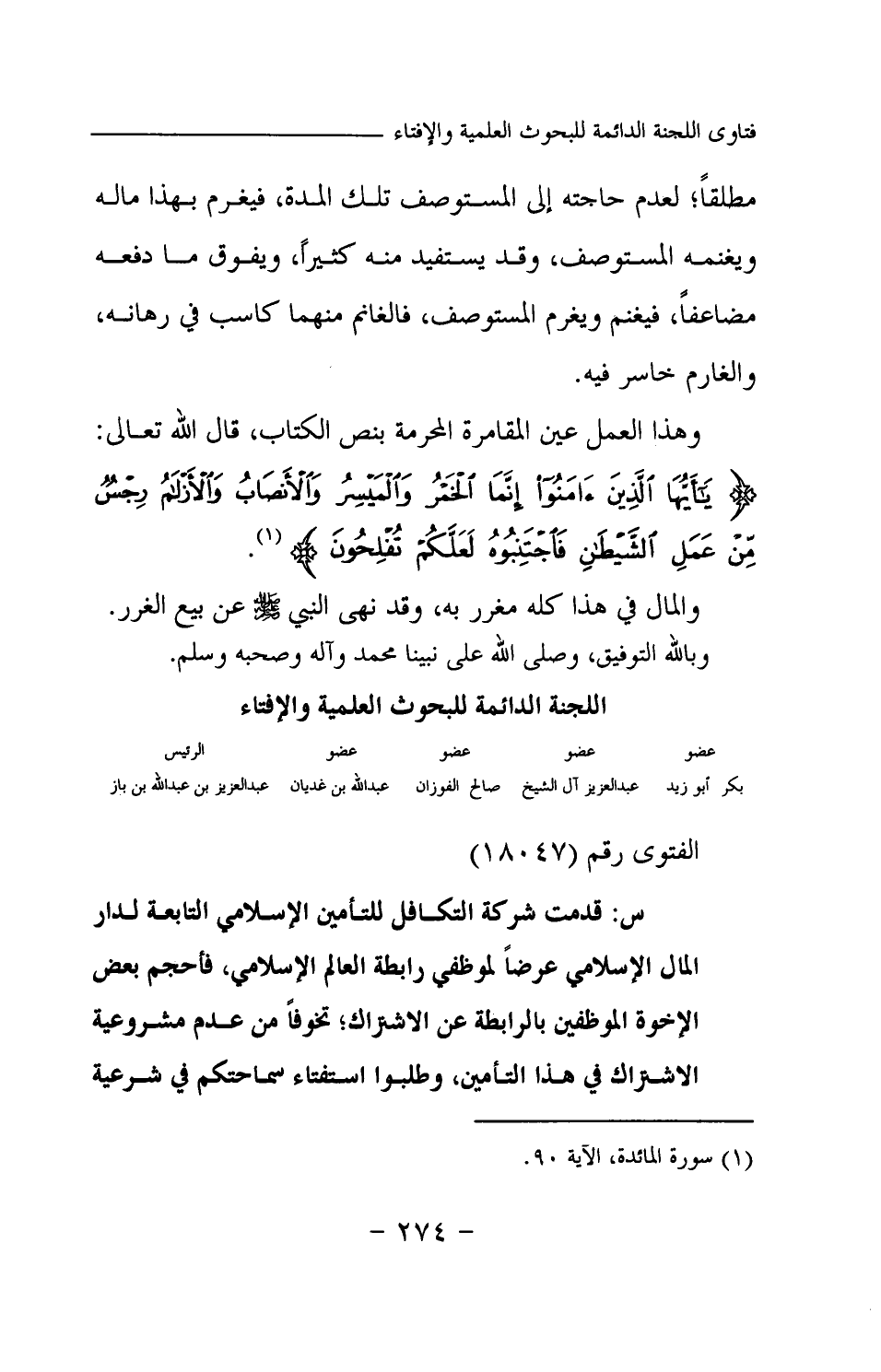 مطلقا؛ لعدم حاجته إلى المستوصف تلك المدة، فيغرم بهذا ماله ويغنمه المستوصف، وقد يستفيد منه كثيرا، ويفوق ما دفعه مضاعفا، فيغنم ويغرم المستوصف، فالغانم منهما كاسب في رهانه، والغارم خاسر فيه. وهذا العمل عين المقامرة المحرمة بنص الكتاب، قال الله تعالى: {يَا أَيُّهَا الَّذِينَ آمَنُوا إِنَّمَا الْخَمْرُ وَالْمَيْسِرُ وَالْأَنْصَابُ وَالْأَزْلَامُ رِجْسٌ مِنْ عَمَلِ الشَّيْطَانِ فَاجْتَنِبُوهُ لَعَلَّكُمْ تُفْلِحُونَ} (¬1) والمال في هذا كله مغرر به، وقد «نهى النبي -صلى الله عليه وسلم- عن بيع الغرر (¬2) » . وبالله التوفيق، وصلى الله على نبينا محمد وآله وصحبه وسلم.