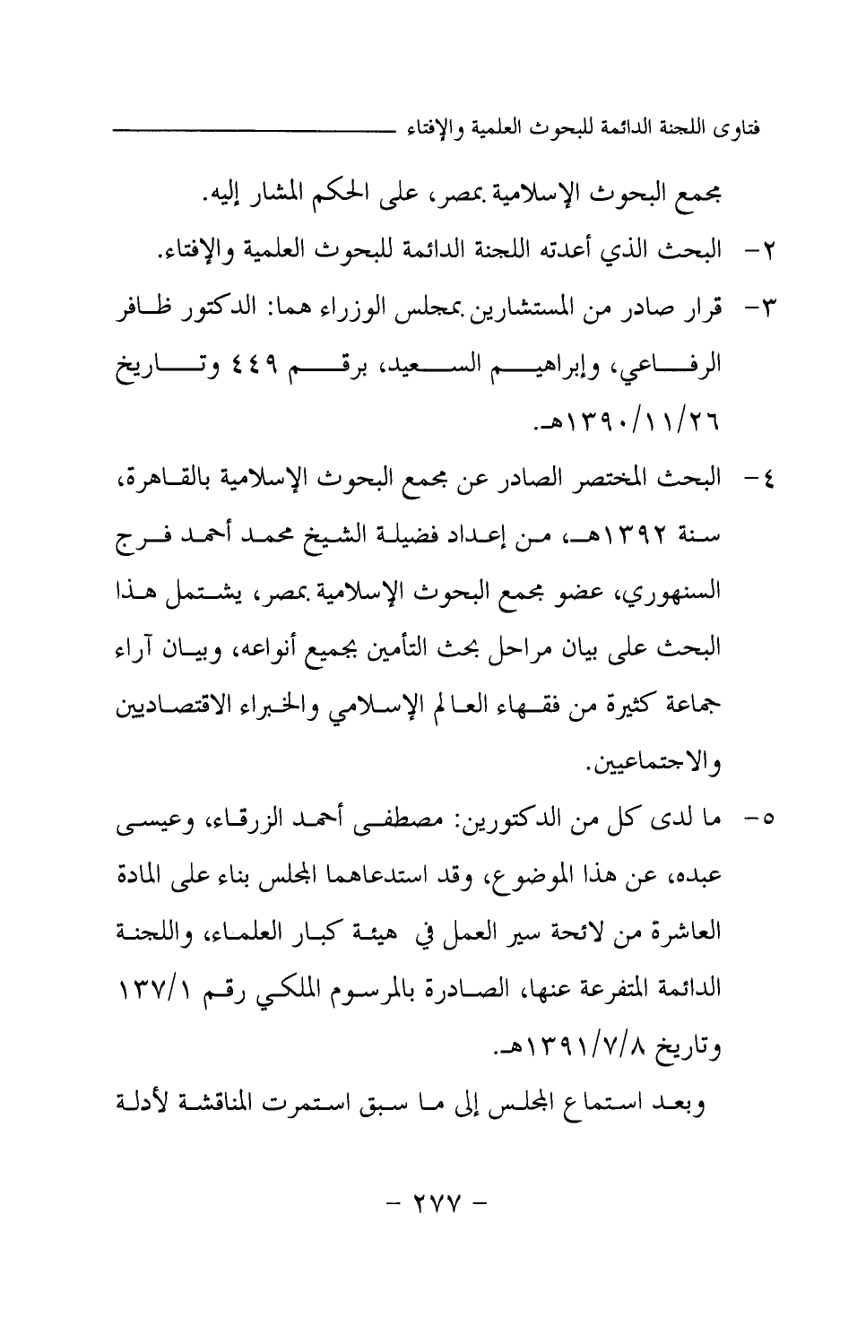 5 - ما لدى كل من الدكتورين: مصطفى أحمد الزرقاء وعيسى عبده عن هذا الموضوع، وقد استدعاهما المجلس بناء على المادة العاشرة من لائحة سير العمل في هيئة كبار العلماء، واللجنة الدائمة المتفرعة عنها، الصادرة بالمرسوم الملكي رقم 1 \ 137 وتاريخ 8 \ 7 \ 1391هـ.