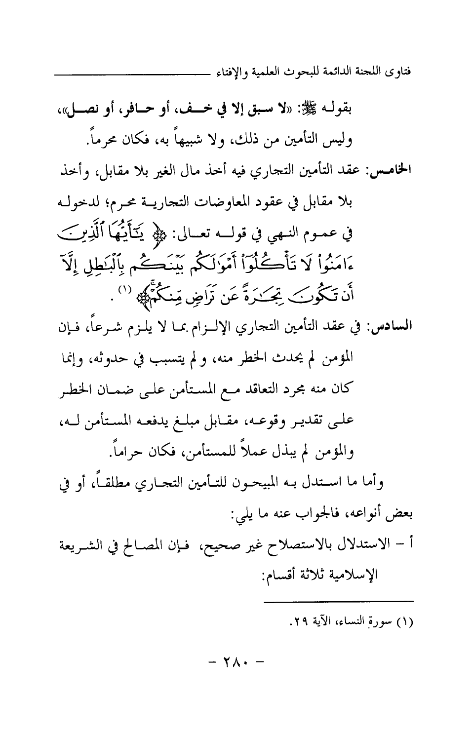 الخامس: عقد التأمين التجاري فيه أخذ مال الغير بلا مقابل، وأخذ بلا مقابل في عقود المعاوضات التجارية محرم؛ لدخوله في عموم النهى في قوله تعالى: {يَا أَيُّهَا الَّذِينَ آمَنُوا لَا تَأْكُلُوا أَمْوَالَكُمْ بَيْنَكُمْ بِالْبَاطِلِ إِلَّا أَنْ تَكُونَ تِجَارَةً عَنْ تَرَاضٍ مِنْكُمْ} (¬2)