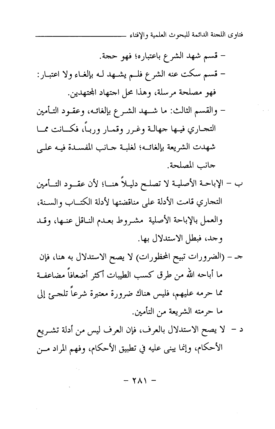 ج- (الضرورات تبيح المحظورات) لا يصح الاستدلال به هنا، فإن ما أباحه الله من طرق كسب الطيبات أكثر أضعافا مضاعفة مما حرمه عليهم، فليس هناك ضرورة معتبرة شرعا تلجئ إلى ما حرمته الشريعة من التأمين.