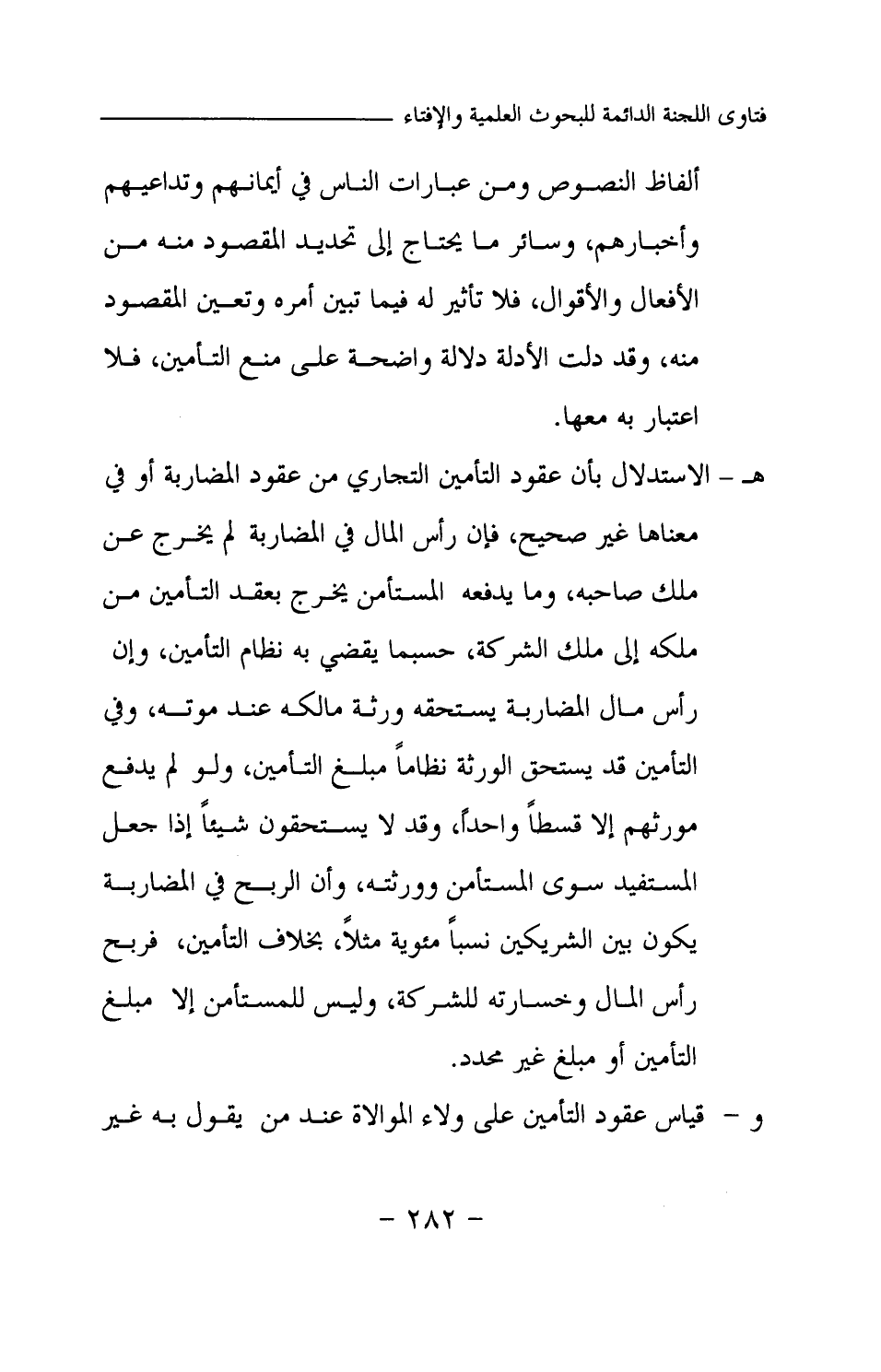 هـ- الاستدلال بأن عقود التأمين التجاري من عقود المضاربة أو في معناها غير صحيح، فإن رأس المال في المضاربة لم يخرج عن ملك صاحبه، وما يدفعه المستأمن يخرج بعقد التأمين من ملكه إلى ملك الشركة، حسبما يقضي به نظام التأمين، وإن رأس مال المضاربة يستحقه ورثة مالكه عند موته، وفي التأمين قد يستحق الورثة نظاما مبلغ التأمين، ولو لم يدفع مورثهم إلا قسطا واحد، وقد لا يستحقون شيئا إذا جعل المستفيد سوى المستأمن وورثته، وأن الربح في المضاربة يكون بين الشريكين نسبا مئوية مثلا، بخلاف التأمين، فربح رأس المال وخسارته للشركة، وليس للمستأمن إلا مبلغ التأمين أو مبلغ غير محدد.