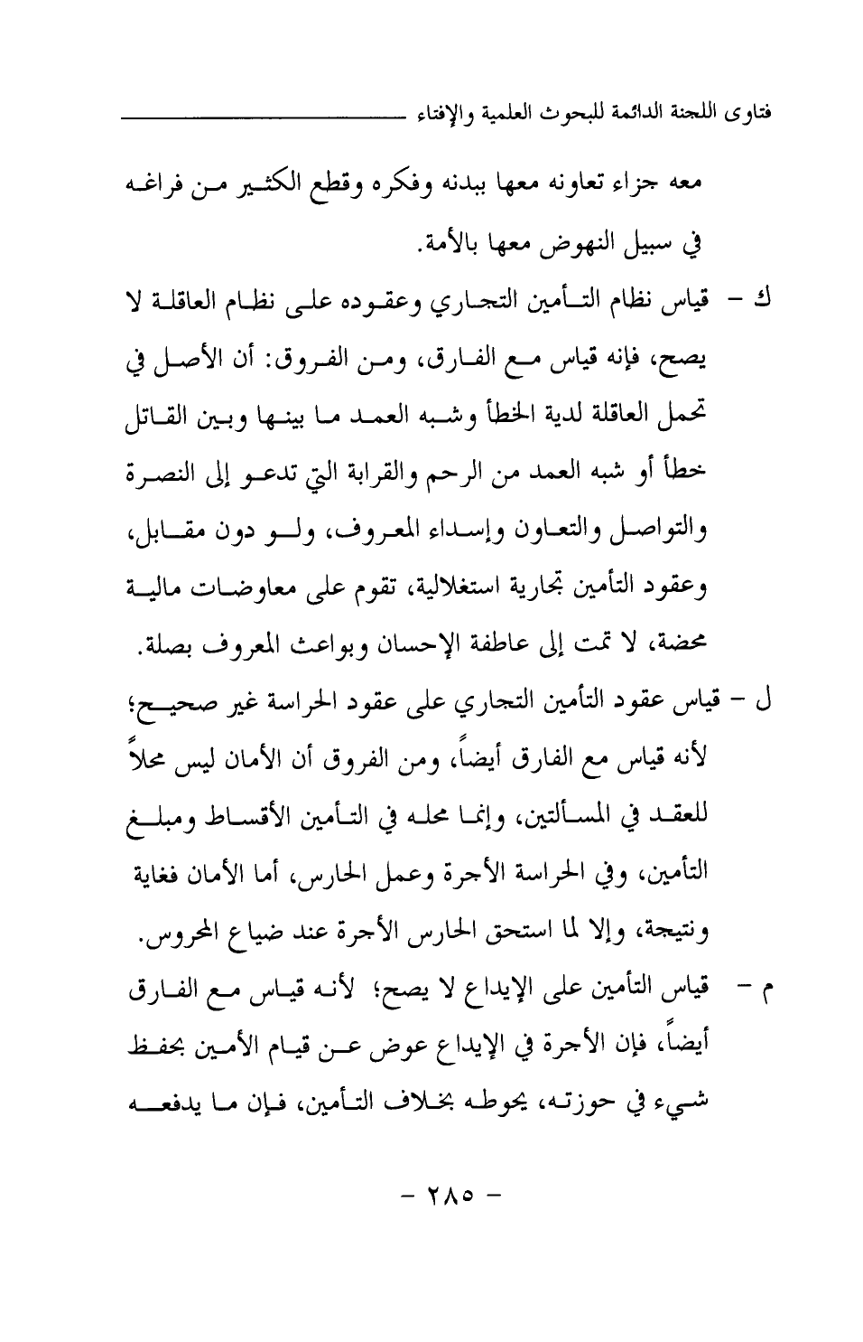 ك- قياس نظام التأمين التجاري وعقوده على نظام العاقلة لا يصح، فإنه قياس مع الفارق، ومن الفروق: أن الأصل في تحمل العاقلة لدية الخطأ وشبه العمد ما بينها وبين القاتل خطأ أو شبه العمد من الرحم والقرابة التي تدعو إلى النصرة والتواصل والتعاون وإسداء المعروف، ولو دون مقابل، وعقود التأمين تجارية استغلالية، تقوم على معاوضات مالية محضة، لا تمت إلى عاطفة الإحسان وبواعث المعروف بصلة.