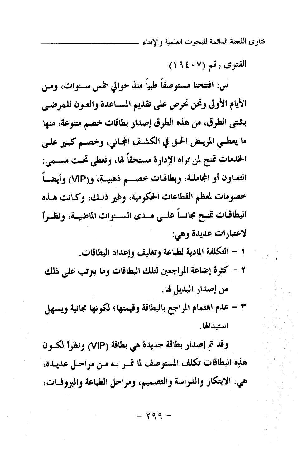 س: افتتحنا مستوصفا طبيا مند حوالي خمس سنوات، ومن الأيام الأولى ونحن نحرص على تقديم المساعدة والعون للمرضى بشتى الطرق، من هذه الطرق إصدار بطاقات خصم متنوعة، منها ما يعطي المريض الحق في الكشف المجاني، وخصم كبير على الخدمات تمنح لمن تراه الإدارة مستحقا لها، وتعطى تحت مسمى: التعاون أو المجاملة، وبطاقات خصم ذهبية، و (vip) وأيضا خصومات لمعظم القطاعات الحكومية، وغير ذلك، وكانت هذه البطاقات تمنح مجانا على مدى السنوات الماضية، ونظرا لاعتبارات عديدة وهي: 1- التكلفة المادية لطباعة وتغليف وإعداد البطاقات. 2- كثرة إضاعة المراجعين لتلك البطاقات وما يترتب على ذلك من إصدار البديل لها. 3- عدم اهتمام المراجع بالبطاقة وقيمتها؛ لكونها مجانية ويسهل استبدالها. وقد تم إصدار بطاقة جديدة هي بطاقة (vip) ونظرا لكون هذه البطاقات تكلف المستوصف لما تمر به من مراحل عديدة، هي: الابتكار والدراسة والتصميم، ومراحل الطباعة والبروفات،