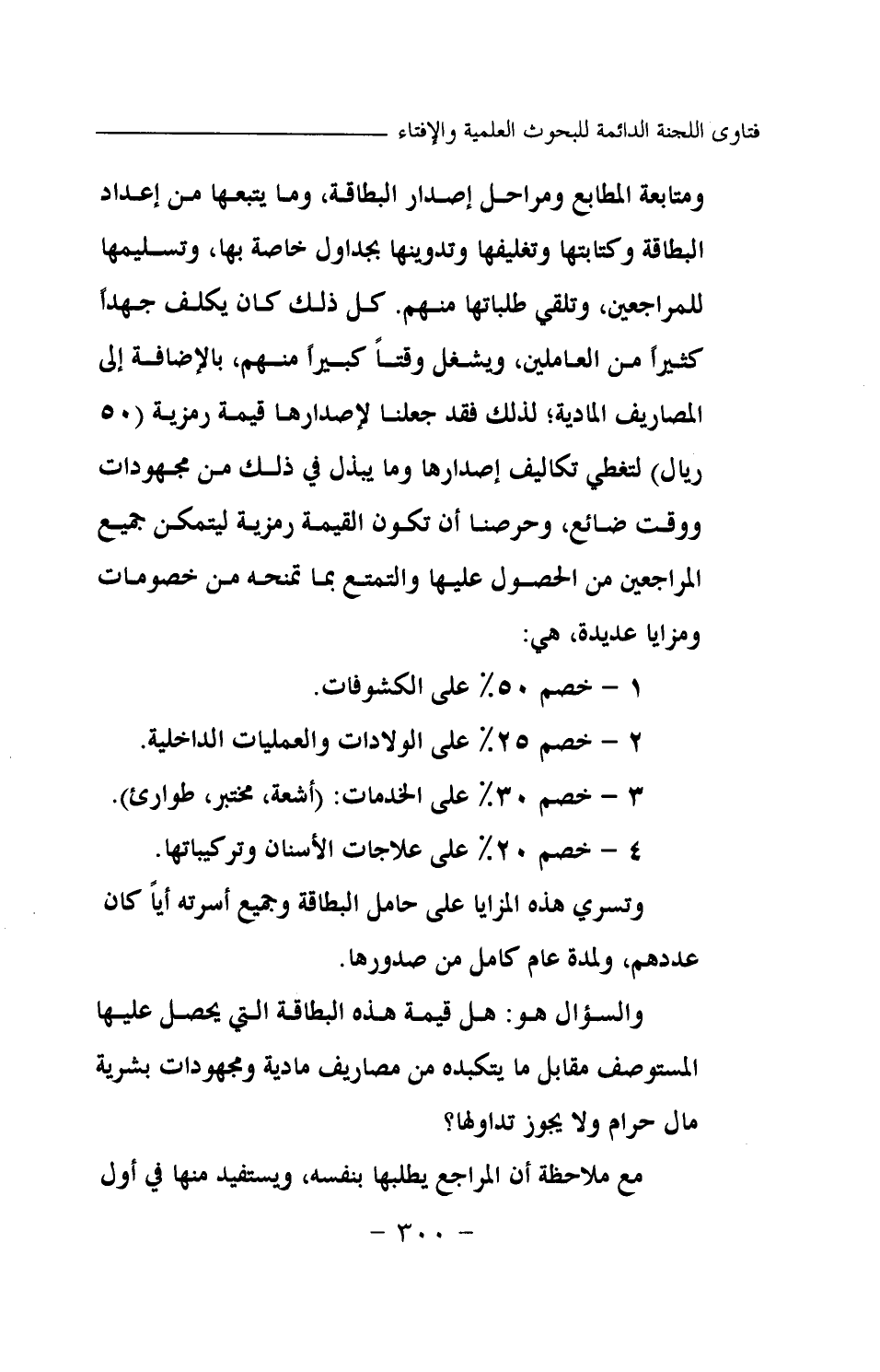 ومتابعة المطابع ومراحل إصدار البطاقة، وما يتبعها من إعداد البطاقة وكتابتها وتغليفها وتدوينها بجداول خاصة بها، وتسليمها للمراجعين، وتلقي طلباتها منهم. كل ذلك كان يكلف جدا كثيرا من العاملين، ويشغل وقتا كبيرا منهم، بالإضافة إلى المصاريف المادية؛ لذلك فقد جعلنا لإصدارها قيمة رمزية (50 ريالا) لتغطي تكاليف إصدارها وما يبذل في ذلك من مجهودات ووقت ضائع، وحرصنا أن تكون القيمة رمزية ليتمكن جميع المراجعين من الحصول عليها والتمتع بما تمنحه من خصومات ومزايا عديدة، هي: 1- خصم 50% على الكشوفات. 2- خصم 25% على الولادات والعمليات الداخلية. 3- خصم 30% على الخدمات: (أشعة، مختبر، طوارئ) . 4- خصم 20% على علاجات الأسنان وتركيباتها. وتسري هذه المزايا على حامل البطاقة وجميع أسرته أيا كان عددهم، ولمدة عام كامل من صدورها. والسؤال هو: هل قيمة هذه البطاقة التي يحصل عليها المستوصف مقابل ما يتكبده من مصاريف مادية ومجهودات بشرية مال حرام ولا يجوز تداولها؟ مع ملاحظة أن المراجع يطلبها بنفسه، ويستفيد منها في أول