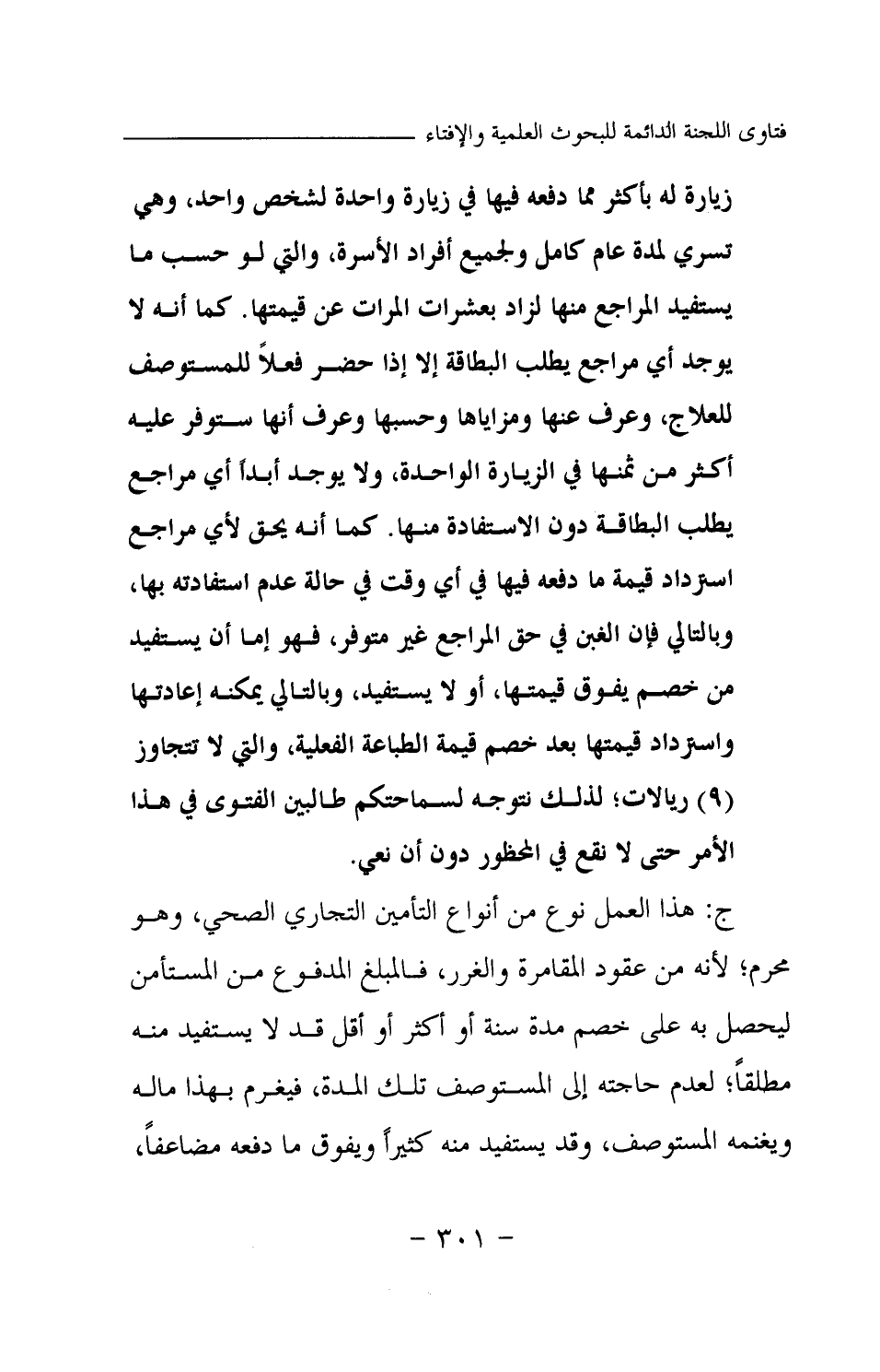 زيارة له بأكثر مما دفعه فيها في زيارة واحدة لشخص واحد، وهي تسري لمدة عام كامل ولجميع أفراد الأسرة، والتي لو حسب ما يستفيد المراجع منها لزاد بعشرات المرات عن قيمتها. كما أنه لا يوجد أي مراجع يطلب البطاقة إلا إذا حضر فعلا للمستوصف للعلاج، وعرف عنها ومزاياها وحسبها وعرف أنها ستوفر عليه أكثر من ثمنها في الزيارة الواحدة، ولا يوجد أبدا أي مراجع يطلب البطاقة دون الاستفادة منها. كما أنه يحق لأي مراجع استرداد قيمة ما دفعه فيها في أي وقت في حالة عدم استفادته بها، وبالتالي فإن الغبن في حق المراجع غير متوفر، فهو إما أن يستفيد من خصم يفوق قيمتها، أو لا يستفيد، وبالتالي يمكنه إعادتها واسترداد قيمتها بعد خصم قيمة الطباعة الفعلية، والتي لا تتجاوز (9) ريالات؛ لذلك نتوجه لسماحتكم طالبين الفتوى في هذا الأمر حتى لا نقع في المحظور دون أن نعي.