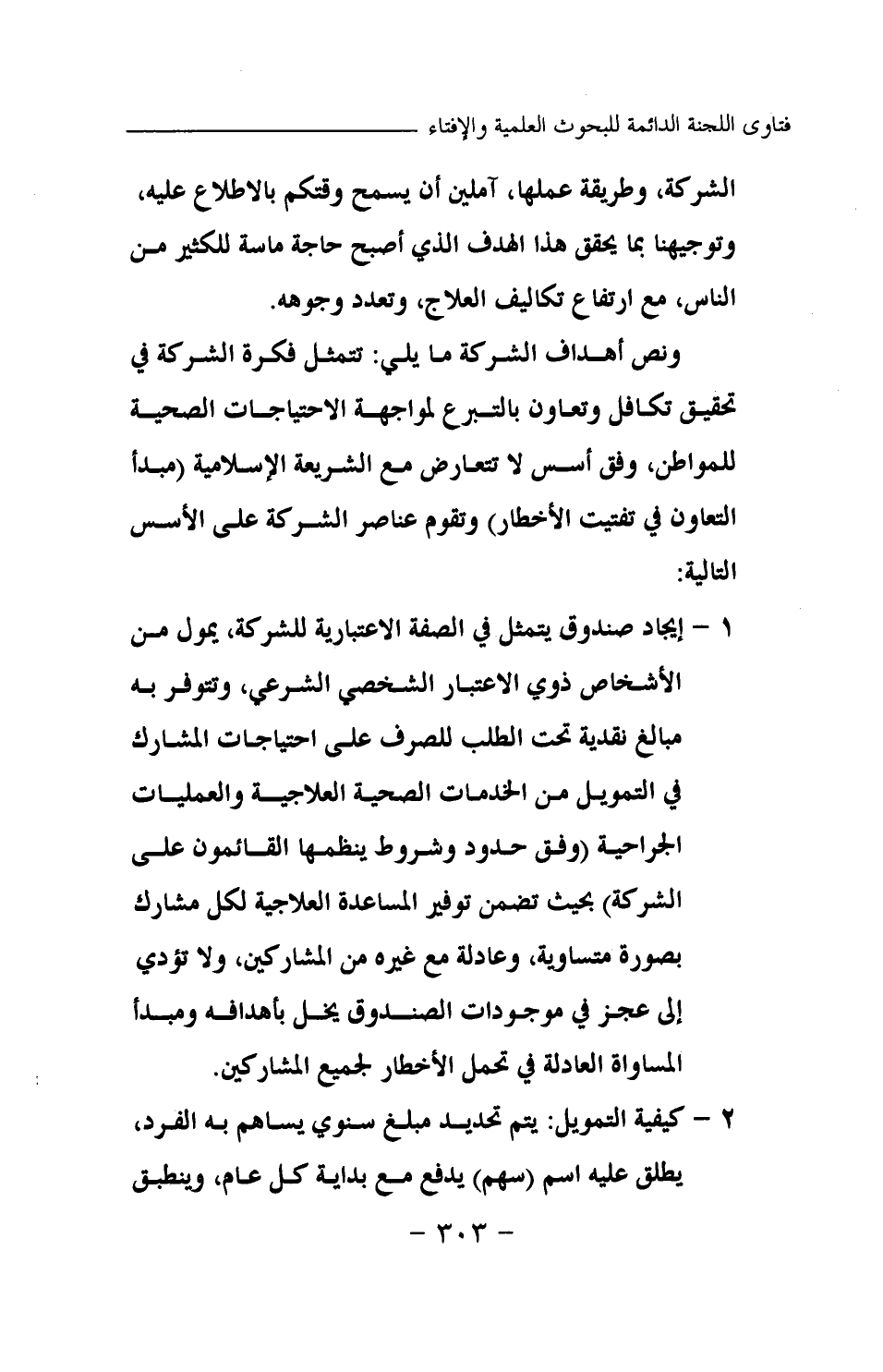 الشركة، وطريقة عملها، آملين أن يسمح وقتكم بالاطلاع عليه، وتوجيهنا بما يحقق هذا الهدف الذي أصبح حاجة ماسة للكثير من الناس، مع ارتفاع تكاليف العلاج، وتعدد وجوهه. ونص أهداف الشركة ما يلي: تتمثل فكرة الشركة في تحقيق تكافل وتعاون بالتبرع لمواجهة الاحتياجات الصحية للمواطن، وفق أسس لا تتعارض مع الشريعة الإسلامية (مبدأ التعاون في تفتيت الأخطار) وتقوم عناصر الشركة على الأسس التالية: 1- إيجاد صندوق يتمثل في الصفة الاعتبارية للشركة، يمول من الأشخاص ذوي الاعتبار الشخصي الشرعي، وتتوفر به مبالغ نقدية تحت الطلب للصرف على احتياجات المشارك في التمويل من الخدمات الصحية العلاجية والعمليات الجراحية (وفق حدود وشروط ينظمها القائمون على الشركة) بحيث تضمن توفير المساعدة العلاجية لكل مشارك بصورة متساوية، وعادلة مع غيره من المشاركين، ولا تؤدي إلى عجز في موجودات الصندوق يخل بأهدافه ومبدأ المساواة العادلة في تحمل الأخطار لجميع المشاركين. 2- كيفية التمويل: يتم تحديد مبلغ سنوي يساهم به الفرد، يطلق عليه اسم (سهم) يدفع مع بداية كل عام، وينطبق