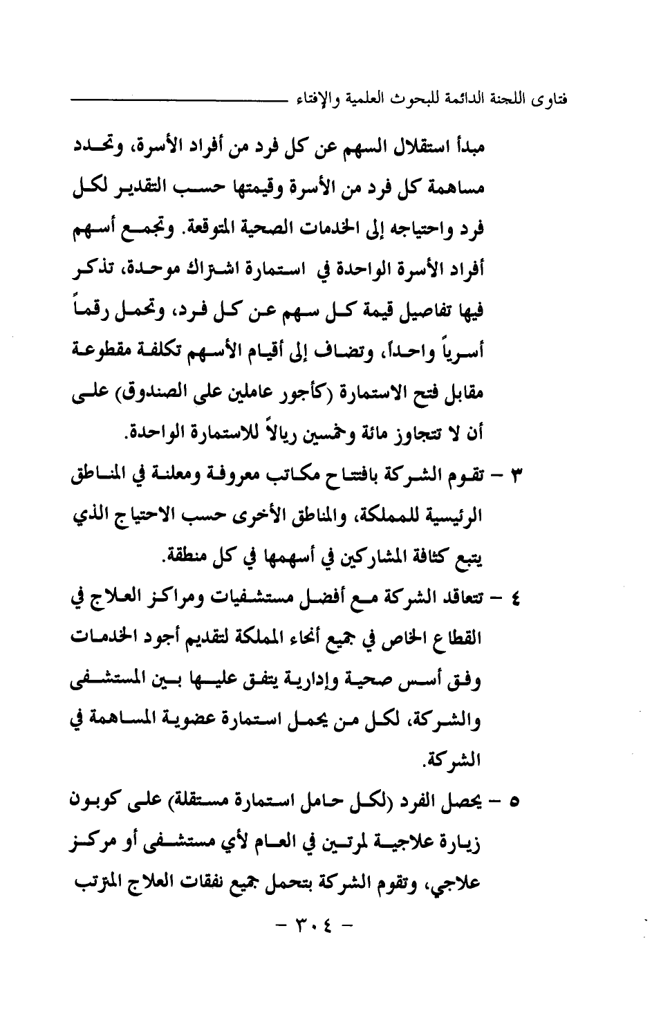 مبدأ استقلال السهم عن كل فرد من أفراد الأسرة، وتحدد مساهمة كل فرد من الأسرة وقيمتها حسب التقدير لكل فرد واحتياجه إلى الخدمات الصحية المتوقعة. وتجمع أسهم أفراد الأسرة الواحدة في استمارة اشتراك موحدة، تذكر فيها تفاصيل قيمة كل سهم عن كل فرد، وتحمل رقما أسريا واحدا، وتضاف إلى أقيام الأسهم تكلفة مقطوعة مقابل فتح الاستمارة (كأجور عاملين على الصندوق) على أن لا تتجاوز مائة وخمسين ريالا للاستمارة الواحدة. 3- تقوم الشركة بافتتاح مكاتب معروفة ومعلنة في المناطق الرئيسية للمملكة والمناطق الأخرى حسب الاحتياج الذي يتبع كثافة المشاركين في أسهمها في كل منطقة. 4- تتعاقد الشركة مع أفضل مستشفيات ومراكز العلاج في القطاع الخاص في جميع أنحاء المملكة لتقديم أجود الخدمات وفق أسس صحية وإدارية يتفق عليها بين المستشفى والشركة، لكل من يحمل استمارة عضو ية المساهمة في الشركة. 5- يحصل الفرد (لكل حامل استمارة مستقلة) على كوبون زيارة علاجية لمرتين في العام لأي مستشفى أو مركز علاجي، وتقوم الشركة بتحمل جميع نفقات العلاج المترتب
