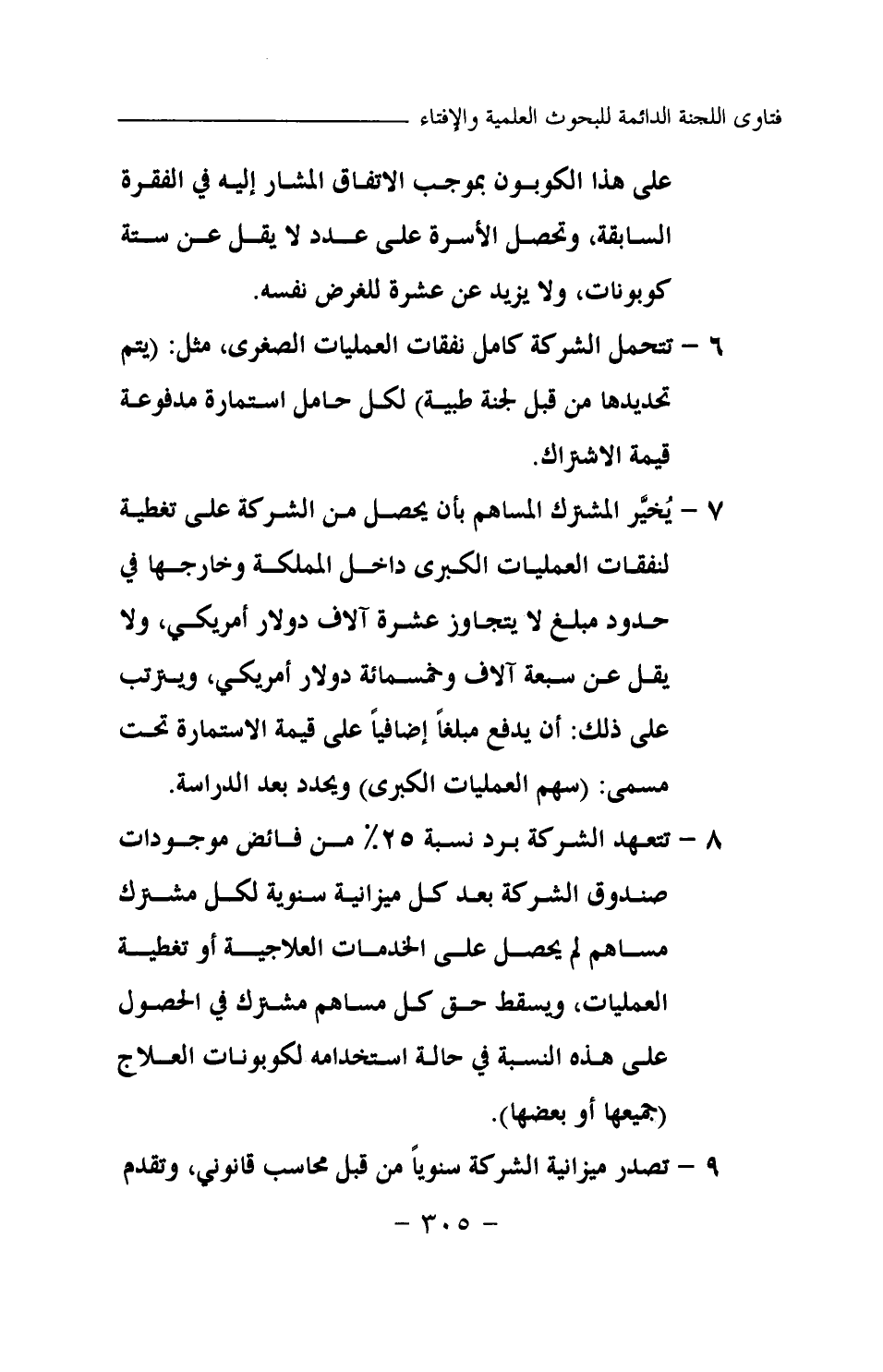 على هذا الكوبون بموجب الاتفاق المشار إليه في الفقرة السابقة، وتحصل الأسرة على عدد لا يقل عن ستة كوبونات، ولا يزيد عن عشرة للغرض نفسه. 6- تتحمل الشركة كامل نفقات العمليات الصغرى، مثل: (يتم تحديدها من قبل لجنة طبية) لكل حامل استمارة مدفوعة قيمة الاشتراك. 7- يخير المشترك المساهم بأن يحصل من الشركة على تغطية لنفقات العمليات الكبرى داخل المملكة وخارجها في حدود مبلغ لا يتجاوز عشرة آلاف دولار أمريكي، ولا يقل عن سبعة آلاف وخمسمائة دولار أمريكي، ويترتب على ذلك: أن يدفع مبلغا إضافيا على قيمة الاستمارة تحت مسمى: (سهم العمليات الكبرى) ويحدد بعد الدراسة. 8- تتعهد الشركة برد نسبة 25% من فائض موجودات صندوق الشركة بعد كل ميزانية سنوية لكل مشترك مساهم لم يحصل على الخدمات العلاجية أو تغطية العمليات، ويسقط حق كل مساهم مشترك في الحصول على هذه النسبة في حالة استخدامه لكوبونات العلاج (جميعها أو بعضها) . 9- تصدر ميزانية الشركة سنويا من قبل محاسب قانوني، وتقدم