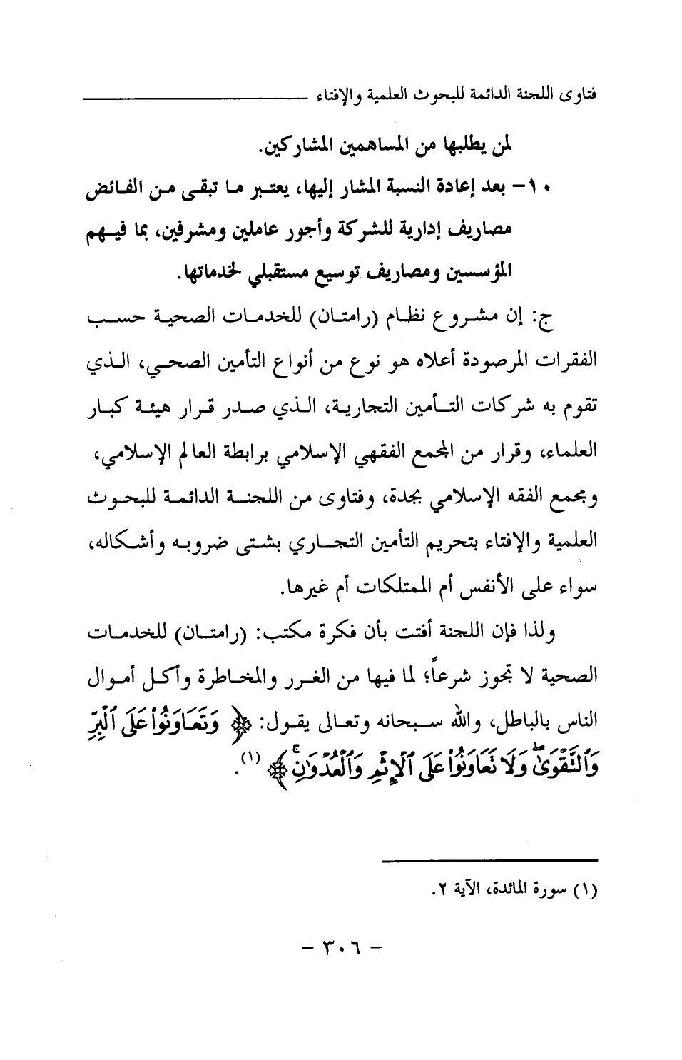 ج: إن مشروع نظام (رامتان) للخدمات الصحية حسب الفقرات المرصودة أعلاه هو نوع من أنواع التأمين الصحي، الذي تقوم به شركات التأمين التجارية، الذي صدر قرار هيئة كبار العلماء، وقرار من المجمع الفقهي الإسلامي برابطة العالم الإسلامي، ومجمع الفقه الإسلامي بجدة وفتاوى من اللجنة الدائمة للبحوث العلمية والإفتاء بتحريم التأمين التجاري بشتى ضروبه وأشكاله، سواء على الأنفس أم الممتلكات أم غيرها. ولذا فان اللجنة أفتت بأن فكرة مكتب: (رامتان) للخدمات الصحية لا تجوز شرعا؛ لما فيها من الغرر والمخاطرة وأكل أموال الناس بالباطل، والله سبحانه وتعالى يقول: {وَتَعَاوَنُوا عَلَى الْبِرِّ وَالتَّقْوَى وَلَا تَعَاوَنُوا عَلَى الْإِثْمِ وَالْعُدْوَانِ} (¬1)