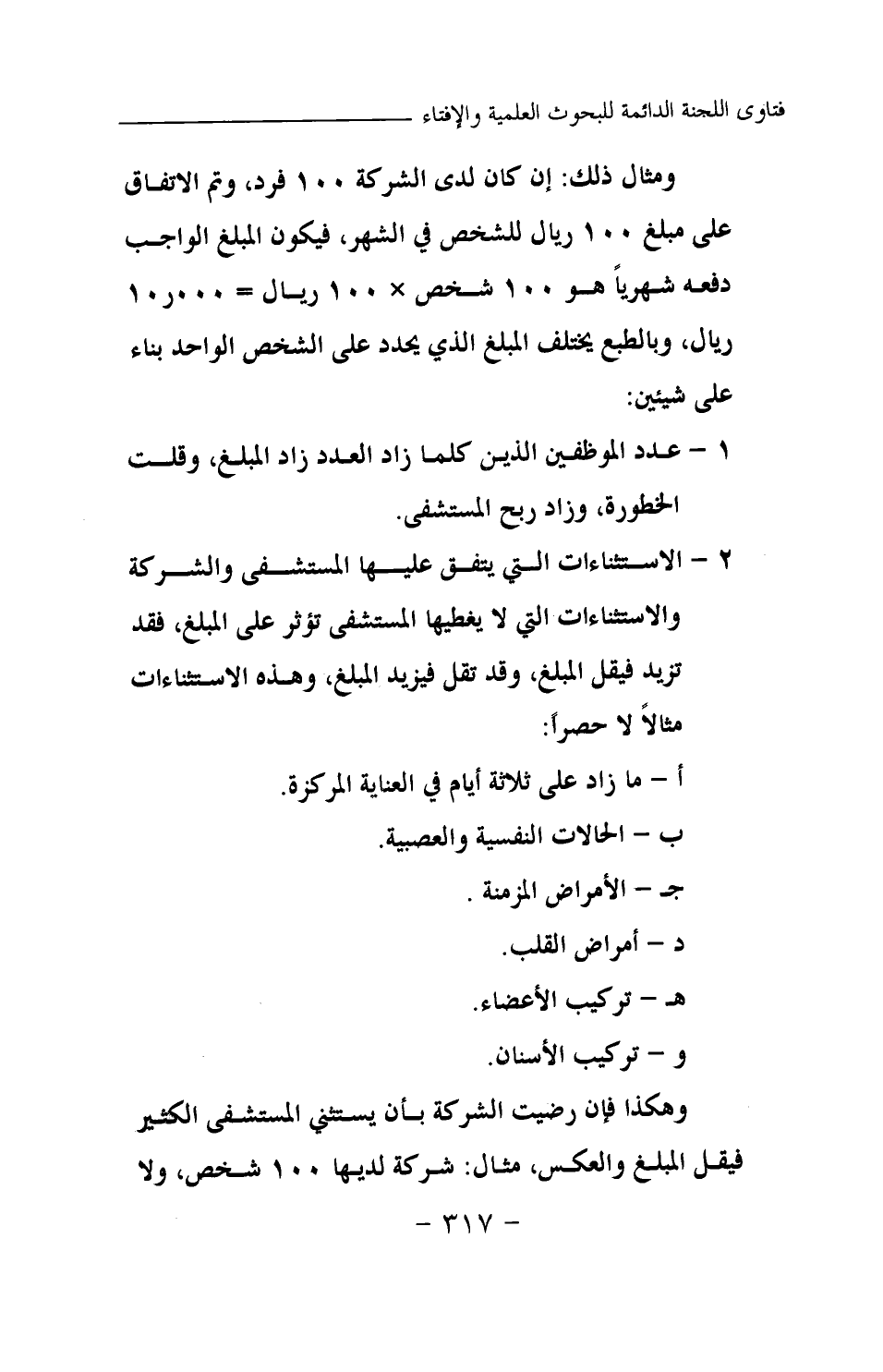 ومثال ذلك: إن كان لدى الشركة 100 فرد، وتم الاتفاق على مبلغ 100 ريال للشخص في الشهر، فيكون المبلغ الواجب دفعه شهريا هو 100 شخص 100ريال = 10000 ريال، وبالطبع يختلف المبلغ الذي يحدد على الشخص الواحد بناء على شيئين: أ- عدد الموظفين الذين كلما زاد العدد زاد المبلغ، وقلت الخطورة، وزاد ربح المستشفى. 2- الاستثناءات التي يتفق عليها المستشفى والشركة والاستثناءات التي لا يغطيها المستشفى تؤثر على المبلغ، فقد تزيد فيقل المبلغ، وقد تقل فيزيد المبلغ، وهذه الاستثناءات مثالا لا حصرا: أ- ما زاد على ثلاثة أيام في العناية المركزة. ب- الحالات النفسية والعصبية. جـ- الأمراض المزمنة. د- أمراض القلب. هـ- تركيب الأعضاء. وتركيب الأسنان. وهكذا فإن رضيت الشركة بأن يستثني المستشفى الكثير فيقل المبلغ والعكس، مثال: شركة لديها 100 شخص، ولا