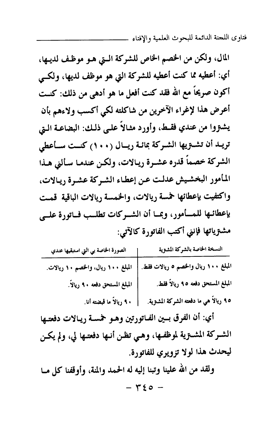 أي: أن الفرق بين الفاتورتين وهو خمسة ريالات دفعتها الشركة المشترية لموظفها، وهي تظن أنها دفعتها لي، ولم يكن ليحدث هذا لولا تزويري للفاتورة. ولقد من الله علينا وتبنا إليه له الحمد والمنة، وأوقفنا كل ما