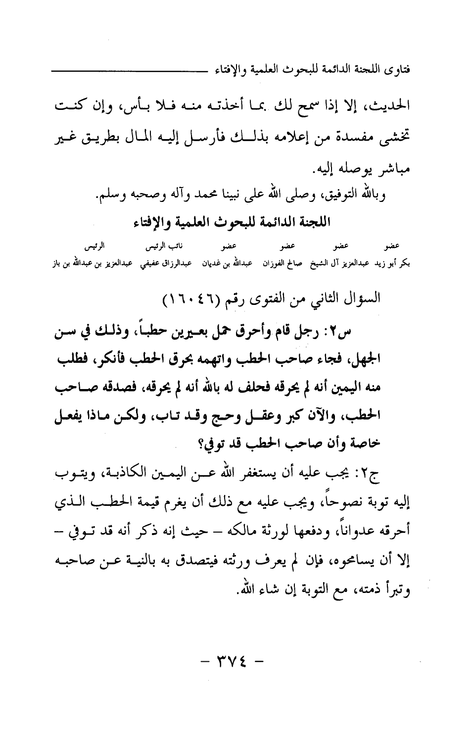 س2: رجل قام وأحرق حمل بعيرين حطبا، وذلك في سن الجهل، فجاء صاحب الحطب واتهمه بحرق الحطب فأنكر، فطلب منه اليمين أنه لم يحرقه، فحلف له بالله أنه لم يحرقه، فصدقه صاحب الحطب، والآن كبر وعقل وحج وقد تاب، ولكن ماذا يفعل خاصة وأن صاحب الحطب قد توفي؟
