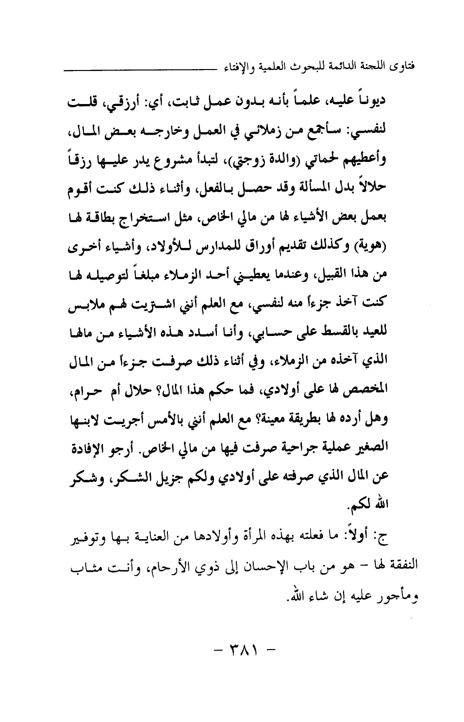 ديونا عليه، علما بأنه بدون عمل ثابت، أي: أرزقي، قلت لنفسي: سأجمع من زملاتي في العمل وخارجه بعض المال، وأعطيهم لحماتي (والدة زوجتي) ، لتبدأ مشروع يدر عليها رزقا حلالا بدل المسألة وقد حصل بالفعل، وأثناء ذلك كنت أقوم بعمل بعض الأشياء لها من مالي الخاص، مثل استخراج بطاقة لها (هوية) وكذلك تقديم أوراق للمدارس للأولاد، وأشياء أخرى من هذا القبيل، وعندما يعطيني أحد الزملاء مبلغا لتوصيله لها كنت أخذ جزءا منه لنفسي، مع العلم أنني اشتريت لهم ملابس للعيد بالقسط على حسابي، وأنا أسدد هذه الأشياء من مالها الذي آخذه من الزملاء، وفي أثناء ذلك صرفت جزءا من المال المخصص لها على أولادي، فما حكم هذا المال؟ حلال أم حرام، وهل أرده لها بطريقة معينة؟ مع العلم أنني بالأمس أجريت لابنها الصغير عملية جراحية صرفت فيها من مالي الخاص. أرجو الإفادة عن المال الذي صرفته على أولادي ولكم جزيل الشكر، وشكر الله لكم.