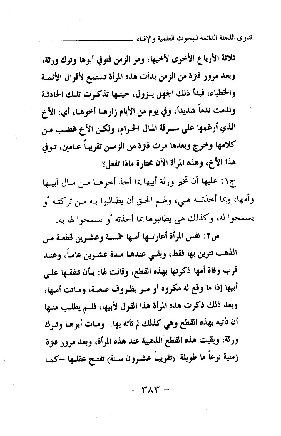 ثلاثة الأرباع الأخرى لأخيها، ومر الزمن فتوفي أبوها وترك ورثة، وبعد مرور فترة من الزمن بدأت هذه المرأة تستمع لأقوال الأئمة والخطباء، فبدأ ذلك الجهل يزول، حينها تذكرت تلك الحادثة وندمت ندما شديدا، وفي يوم من الأيام زارها أخوها، أي: الأخ الذي أرغمها على سرقة المال الحرام، ولكن الأخ غضب من كلامها وخرج وبعدها مرت فترة من الزمن تقريبا عامين، توفي هذا الأخ، وهذه المرأة الآن محتارة ماذا تفعل؟