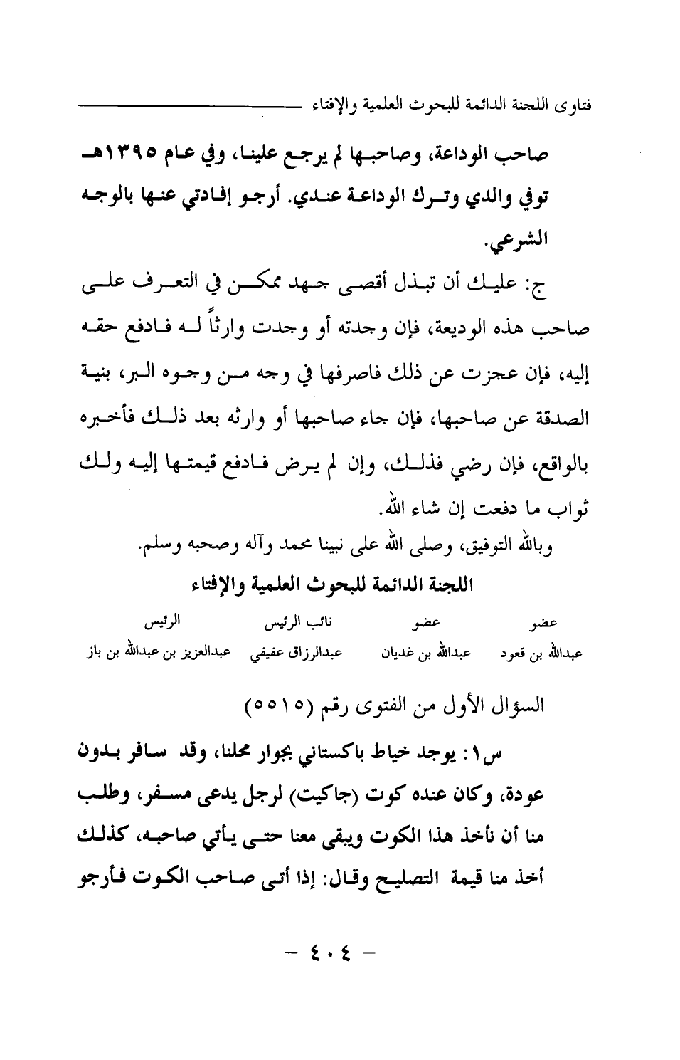س1: يوجد خياط باكستاني بجوار محلنا، وقد سافر بدون عودة، وكان عنده كوت (جاكيت) لرجل يدعى مسفر، وطلب منا أن نأخذ هذا الكوت ويبقى معنا حتى يأتي صاحبه، كذلك أخذ منا قيمة التصليح وقال: إذا أتى صاحب الكوت فأرجو