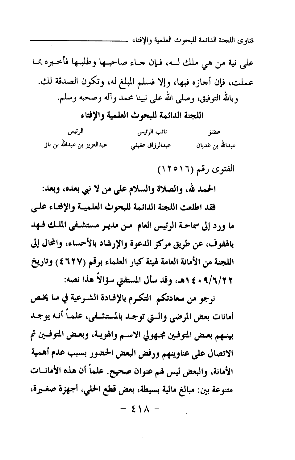 الحمد لله، والصلاة والسلام على من لا نبي بعده، وبعد: فقد اطلعت اللجنة الدائمة للبحوث العلمية والإفتاء على ما ورد إلى سماحة الرئيس العام من مدير مستشفى الملك فهد بالهفوف عن طريق مركز الدعوة والإرشاد بالأحساء والمحال إلى اللجنة من الأمانة العامة هيئة كبار العلماء برقم (4627) وتاريخ 22 \ 6 \ 1409 هـ، وقد سأل المستفتي سؤالا هذا نصه: نرجو من سعادتكم التكرم بالإفادة الشرعية في ما يخص أمانات بعض المرضى والتي توجد بالمستشفى، علما أنه يوجد بينهم بعض المتوفين مجهولي الاسم والهوية، وبعض المتوفين تم الاتصال على عناوينهم ورفض البعض الحضور بسبب عدم أهمية الأمانة، والبعض ليس لهم عنوان صحيح. علما أن هذه الأمانات متنوعة بين: مبالغ مالية بسيطة، بعض قطع الحلي، أجهزة صغيرة،
