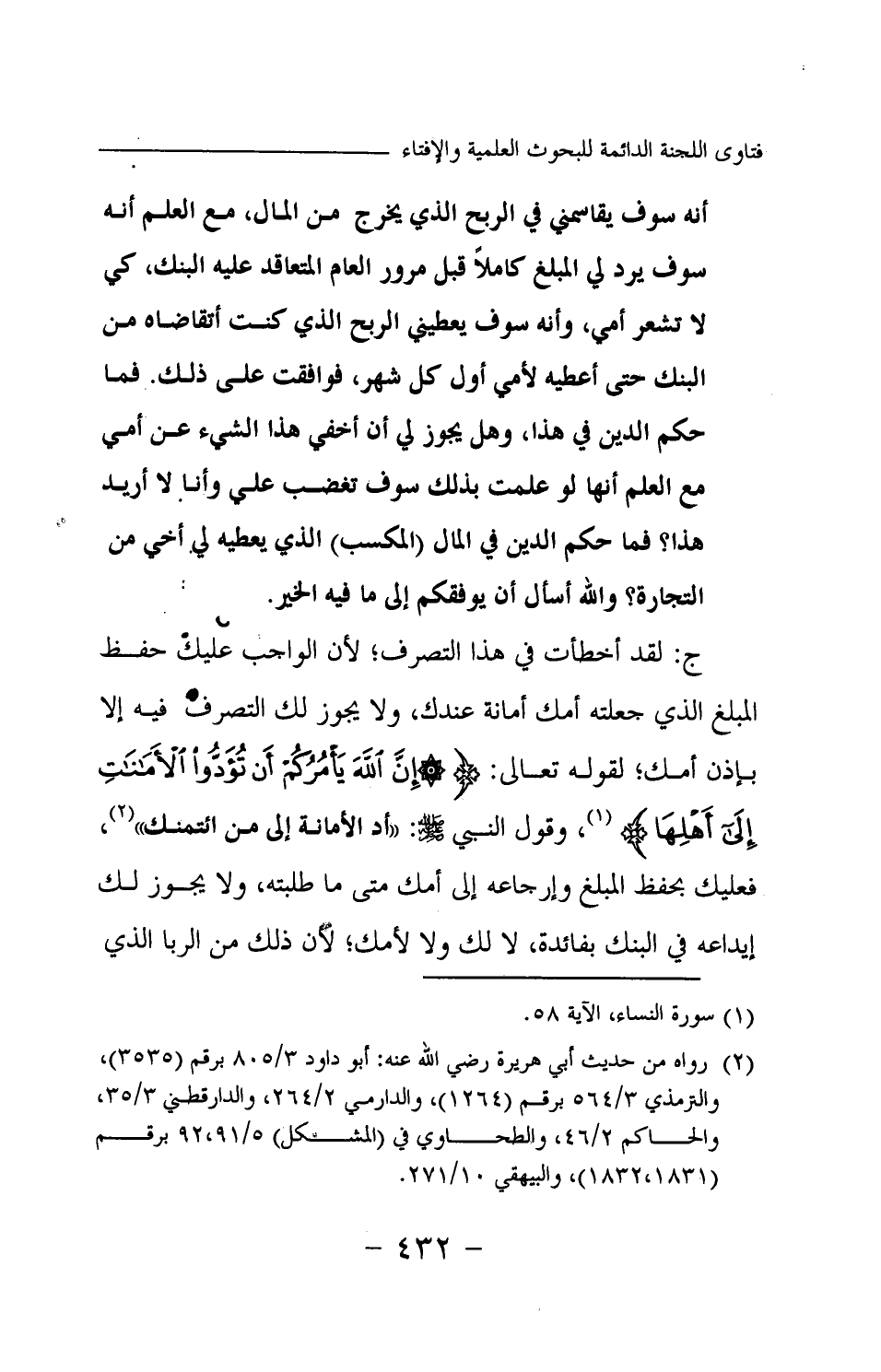 ج: لقد أخطأت في هذا التصرف؛ لأن الواجب عليك حفظ المبلغ الذي جعلته أمك أمانة عندك، ولا يجوز لك التصرف فيه إلا بإذن أمك؛ لقوله -تعالى-: {إِنَّ اللَّهَ يَأْمُرُكُمْ أَنْ تُؤَدُّوا الْأَمَانَاتِ إِلَى أَهْلِهَا} (¬1) وقول النبي -صلى الله عليه وسلم-: «أد الأمانة إلى من ائتمنك (¬2) » فعليك بحفظ المبلغ وإرجاعه إلى أمك متى ما طلبته، ولا يجوز لك إيداعه في البنك بفائدة، لا لك ولا لأمك؛ لأن ذلك من الربا الذي