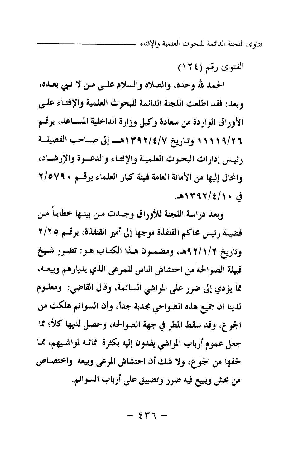 الحمد لله وحده، والصلاة والسلام على من لا نبي بعده، وبعد: فقد اطلعت اللجنة الدائمة للبحوث العلمية والإفتاء على الأوراق الواردة من سعادة وكيل وزارة الداخلية المساعد، برقم 26 \ 11119 وتاريخ 7 \ 4 \ 1392هـ إلى صاحب الفضيلة رئيس إدارات البحوث العلمية والإفتاء والدعوة والإرشاد، والمحال إليها من الأمانة العامة لهيئة كبار العلماء برقم 5790 \ 2 في 10 \ 4 \ 1392 هـ. وبعد دراسة اللجنة للأوراق وجدت من بينها خطابا من فضيلة رئيس محاكم القنفذة موجها إلى أمير القنفذة برقم 25 \ 2 وتاريخ 2 \ 1 \ 92 هـ، ومضمون هذا الكتاب هو: تضرر شيخ قبيلة الصوالحة من احتشاش الناس للمرعى الذي بديارهم وبيعه، مما يؤدي إلى ضرر على المواشي السائمة، وقال القاضي: ومعلوم لدينا أن جميع هذه الضواحي مجدبة جدا، وأن السوائم هلكت من الجوع، وقد سقط المطر في جهة الصوالحة وحصل لديها كلأ؛ مما جعل عموم أرباب المواشي يفدون إليه بكثرة نمائه لمواشيهم، مما لحقها من الجوع، ولا شك أن احتشاش المرعى وبيعه واختصاص من يحش ويبيع فيه ضرر وتضييق على أرباب السوائم.