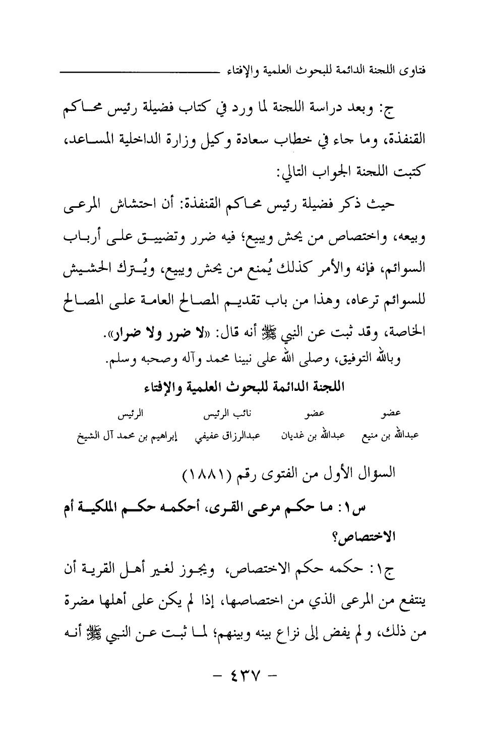 ج: وبعد دراسة اللجنة لما ورد في كتاب فضيلة رئيس محاكم القنفذة وما جاء في خطاب سعادة وكيل وزارة الداخلية المساعد، كتبت اللجنة الجواب التالي: حيث ذكر فضيلة رئيس محاكم القنفذة أن احتشاش المرعى وبيعه، واختصاص من يحش ويبيع؛ فيه ضرر وتضييق على أرباب السوائم، فإنه والأمر كذلك يمنع من يحش ويبيع، ويترك الحشيش للسوائم ترعاه، وهذا من باب تقديم المصالح العامة على المصالح الخاصة، وقد ثبت عن النبي -صلى الله عليه وسلم- أنه قال: «لا ضرر ولا ضرار (¬1) » . وبالله التوفيق، وصلى الله على نبينا محمد وآله وصحبه وسلم.