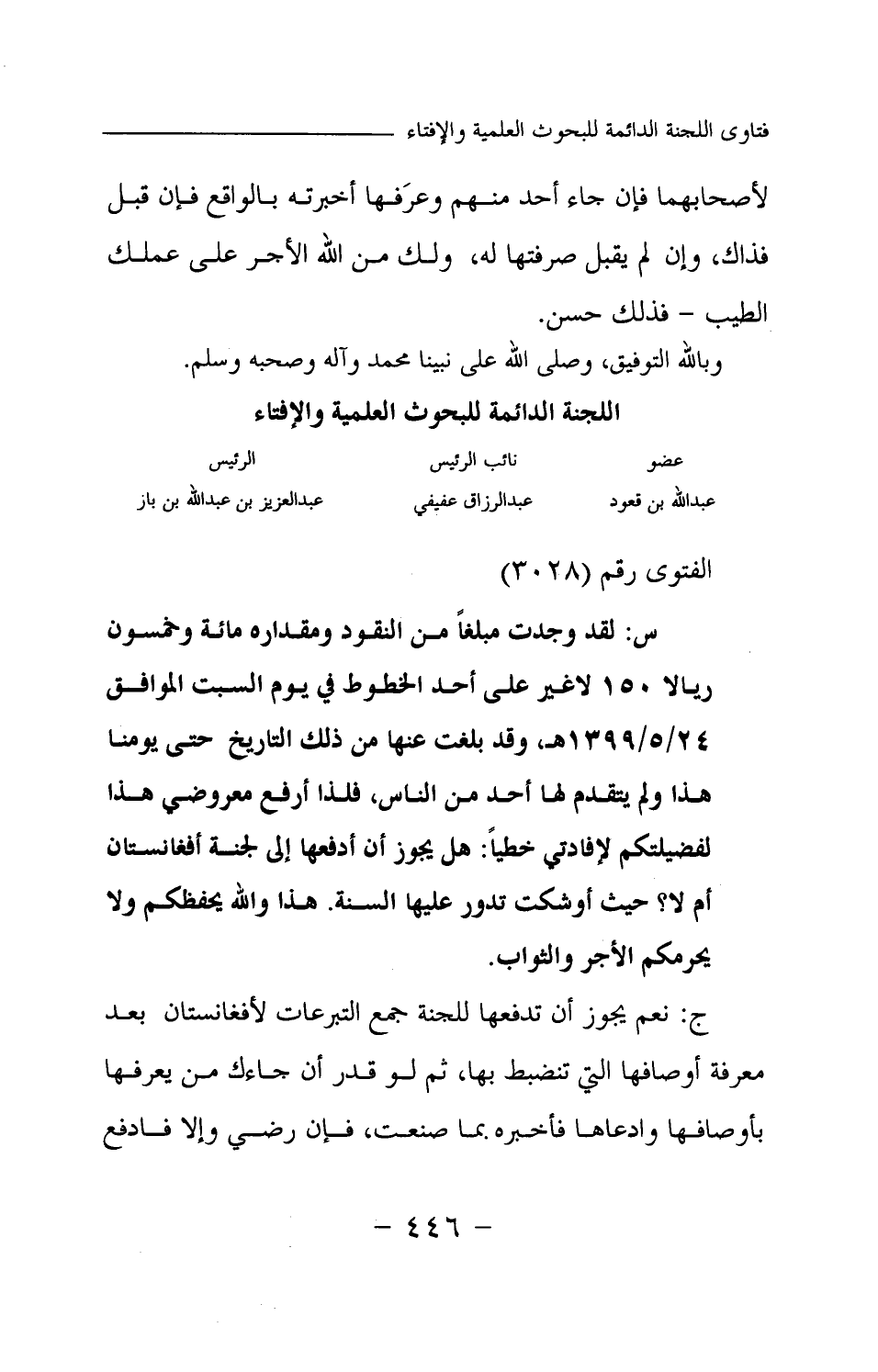 س: لقد وجدت مبلغا من النقود ومقداره مائة وخمسون ريالا 150 لا غير على أحد الخطوط في يوم السبت الموافق24 \ 5 \ 1399 هـ، وقد بلغت عنها من ذلك التاريخ حتى يومنا هذا ولم يتقدم لها أحد من الناس؛ فلذا أرفع معروضي هذا لفضيلتكم لإفادتي خطيا: هل يجوز أن أدفعها إلى لجنة أفغانستان أم لا؟ حيث أوشكت تدور عليها السنة. هذا والله يحفظكم ولا يحرمكم الأجر والثواب.