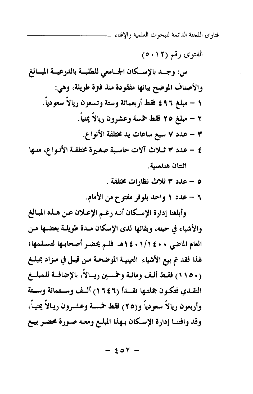 س: وجد بالإسكان الجامعي للطلبة بالدرعية المبالغ والأصناف الموضح بيانها مفقودة منذ فترة طويلة، وهي: 1- مبلغ 496 فقط أربعمائة وستة وتسعون ريالا سعوديا. 2- مبلغ 25 فقط خمسة وعشرون ريالا يمنيا. 3- عدد 7 سبع ساعات يد مختلفة الأنواع. 4- عدد 3 ثلاث آلات حاسبة صغيرة مختلفة الأنواع، منها اثنتان هندسية. 5- عدد 3 ثلاث نظارات مختلفة. 6- عدد (1) واحد بلوفر مفتوح من الأمام. وأبلغنا إدارة الإسكان أنه رغم الإعلان عن هذه المبالغ والأشياء في حينه، وبقائها لدى الإسكان مدة طويلة بعضها من العام الماضي 1400 \ 1401 هـ فلم يحضر أصحابها لتسلمها؛ لهذا فقد تم بيع الأشياء العينية الموضحة من قبل في مزاد بمبلغ (1150) فقط ألف ومائة وخمسين ريالا، بالإضافة للمبلغ النقدي فتكون جملتها نقدا (1646) ألف وستمائة وستة وأربعون ريالا سعوديا و (25) فقط خمسة وعشرون ريالا يمنيا، وقد وافتنا إدارة الإسكان بهذا المبلغ ومعه صورة محضر بيع